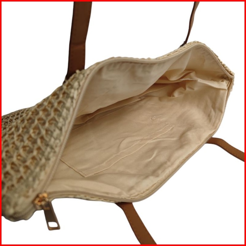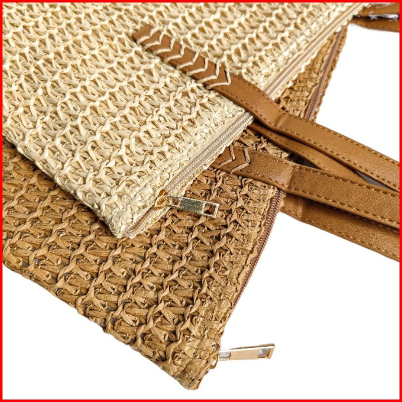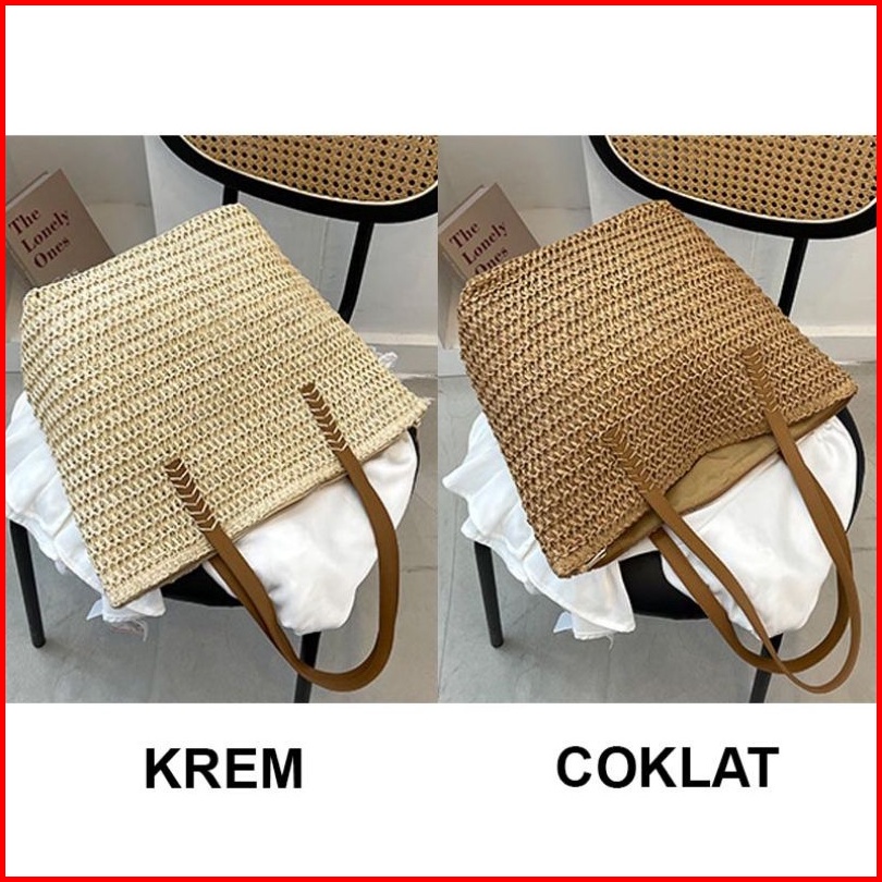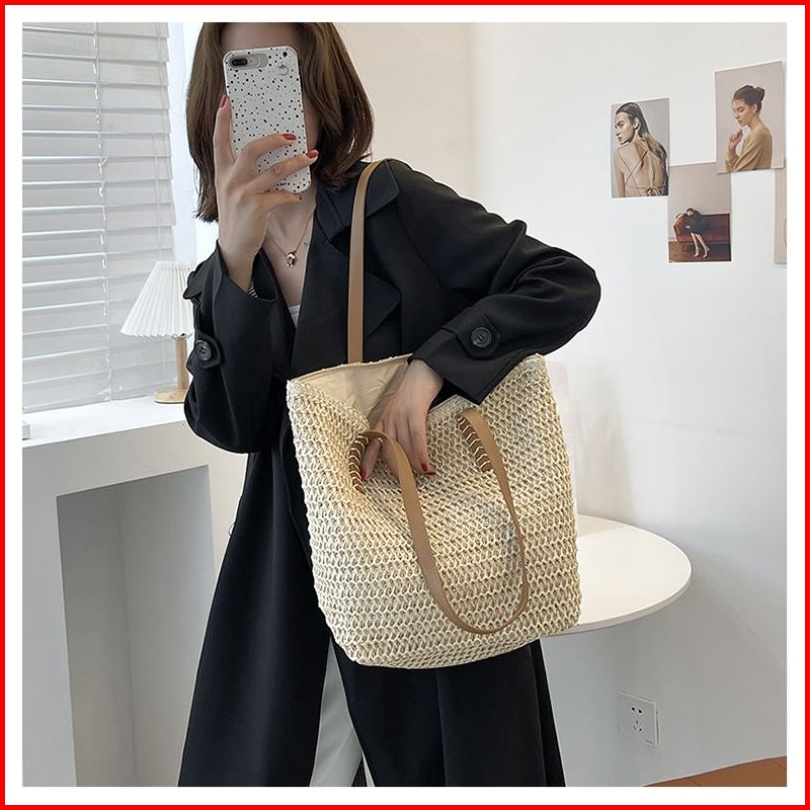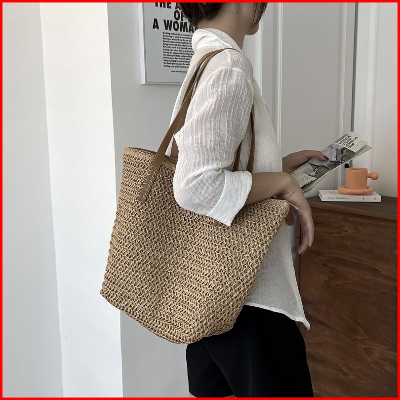 Tas Wanita Anyam Jerami Tw208 Woman Large Straw Woven Tote Bag With Leather Straps Bohemian Style