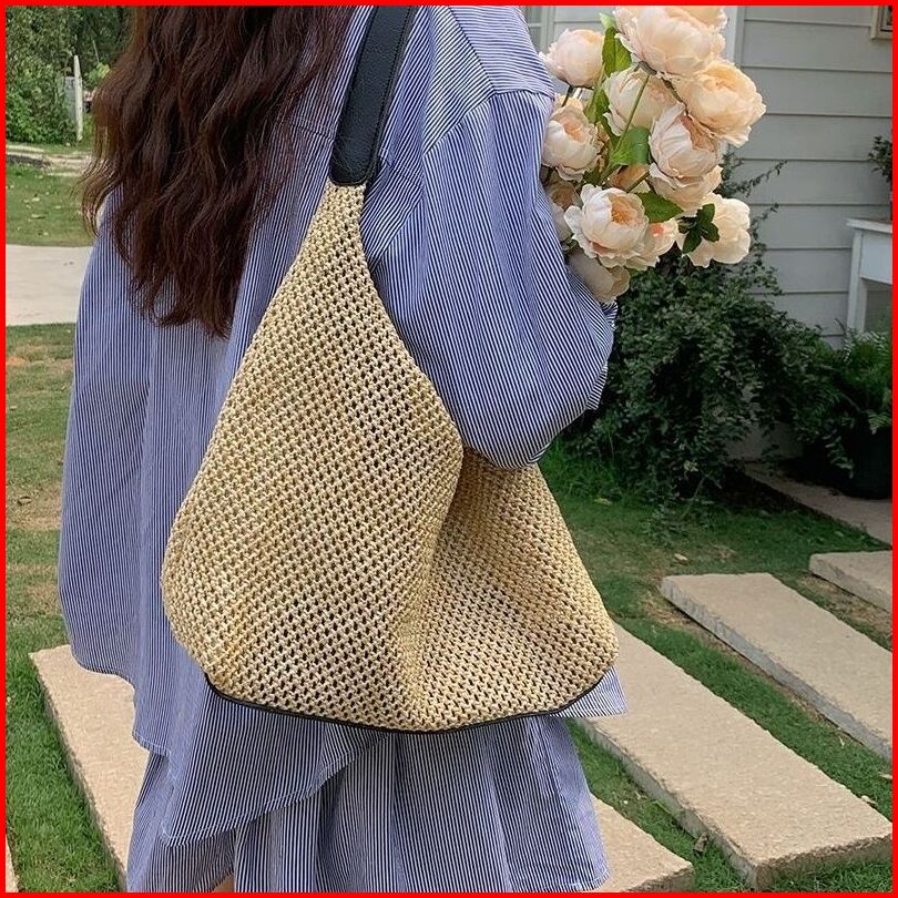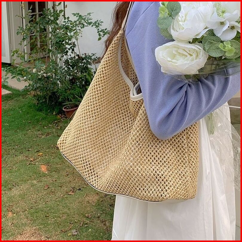 Tas Anyaman Pantai Gaya Liburan Tas Anyaman Bahu Tas Fashion Wanita Tote Tas Ketiak Jerami Berlubang Tas Bahu Kapasitas
