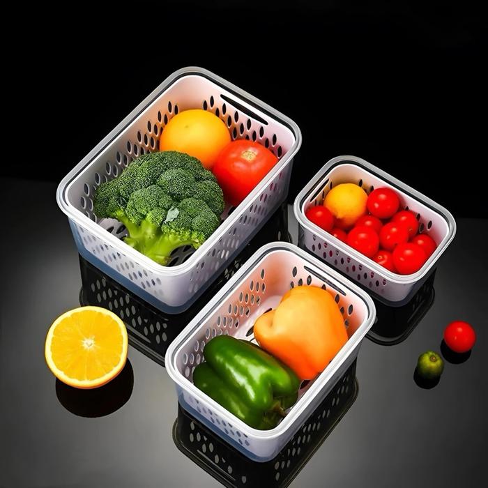 [Mall] PAKET 2 SET 6 PCS 3 UKURAN FOOD CONTAINER KOTAK PENYIMPANAN MAKANAN BUAH DAN SAYUR KULKAS / KERANJANG SARINGAN PE