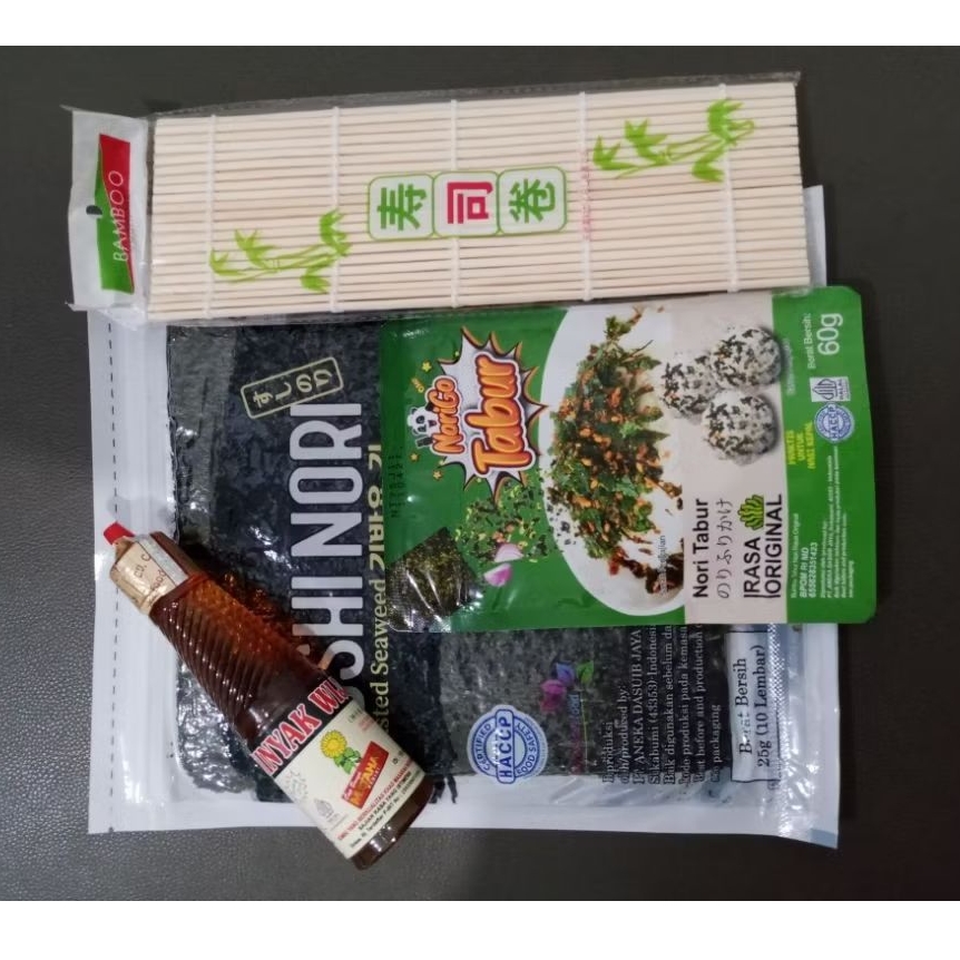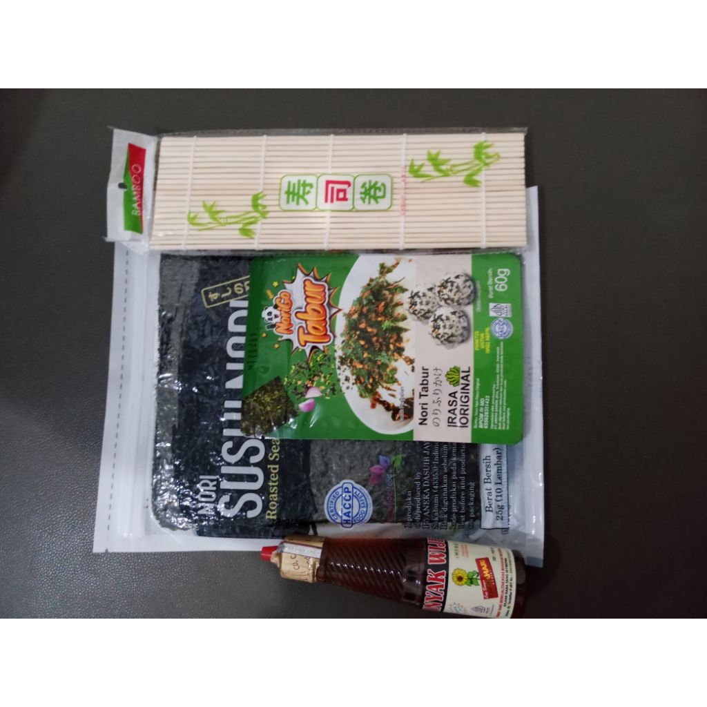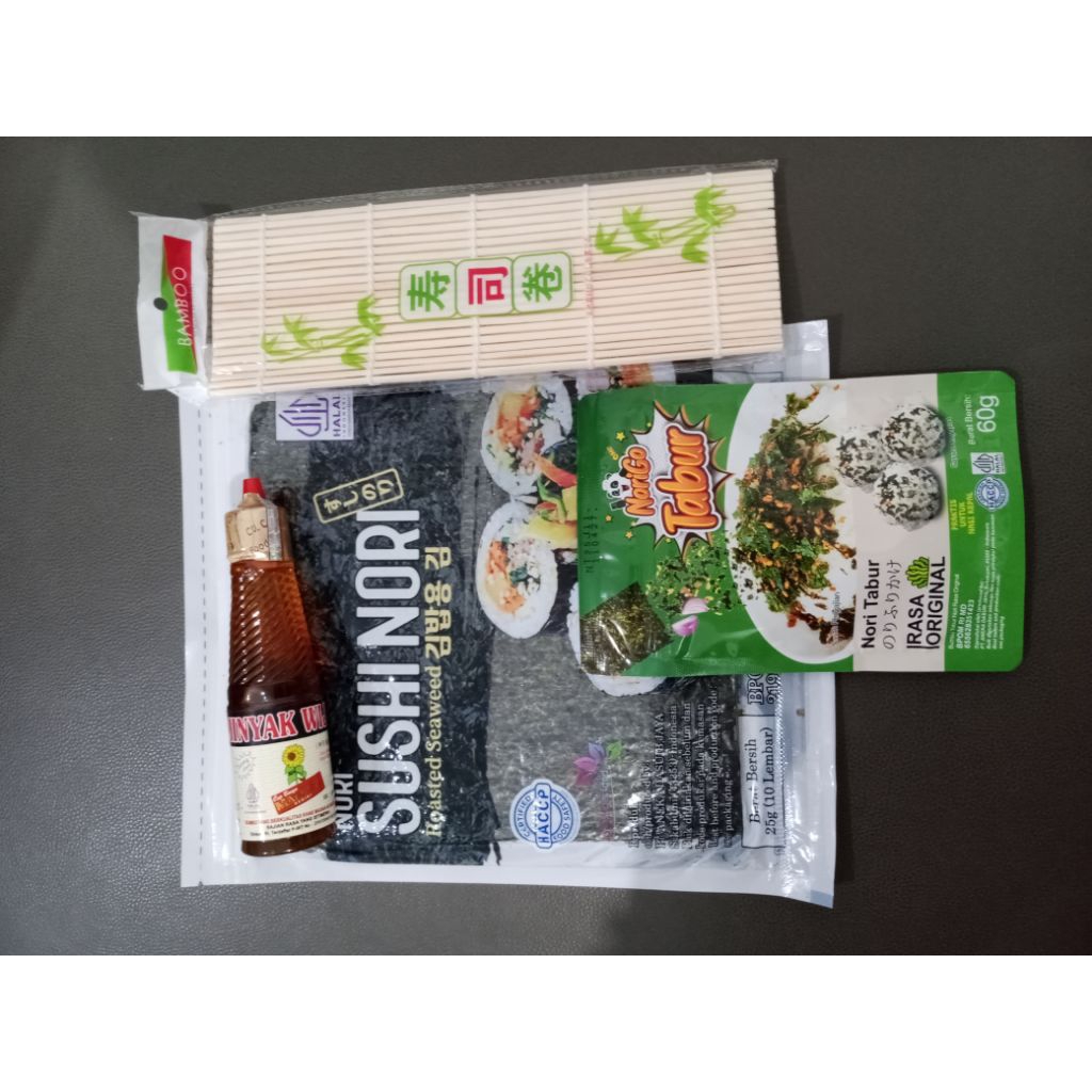 Paket 4 produk sushi nori isi 10 + minyak wijen + nori tabur + alat penggulung sushi bamboo
