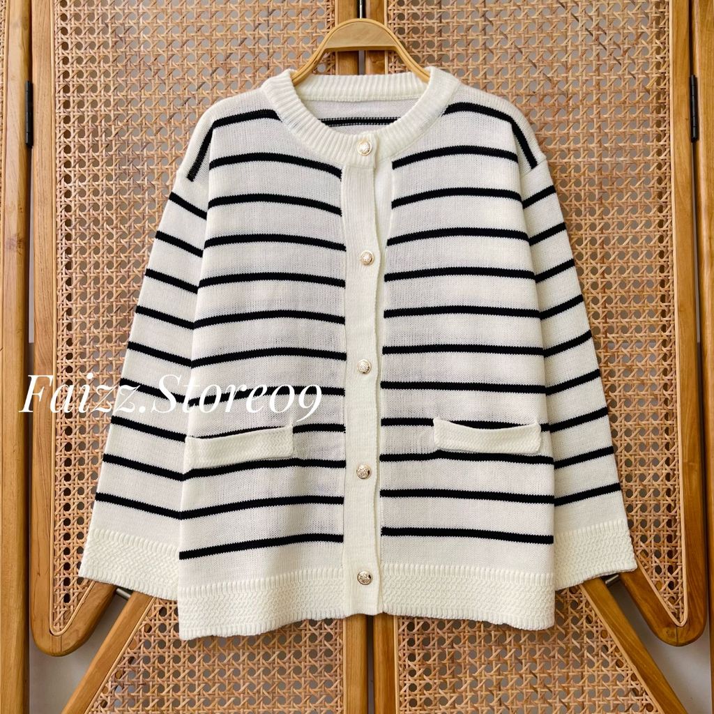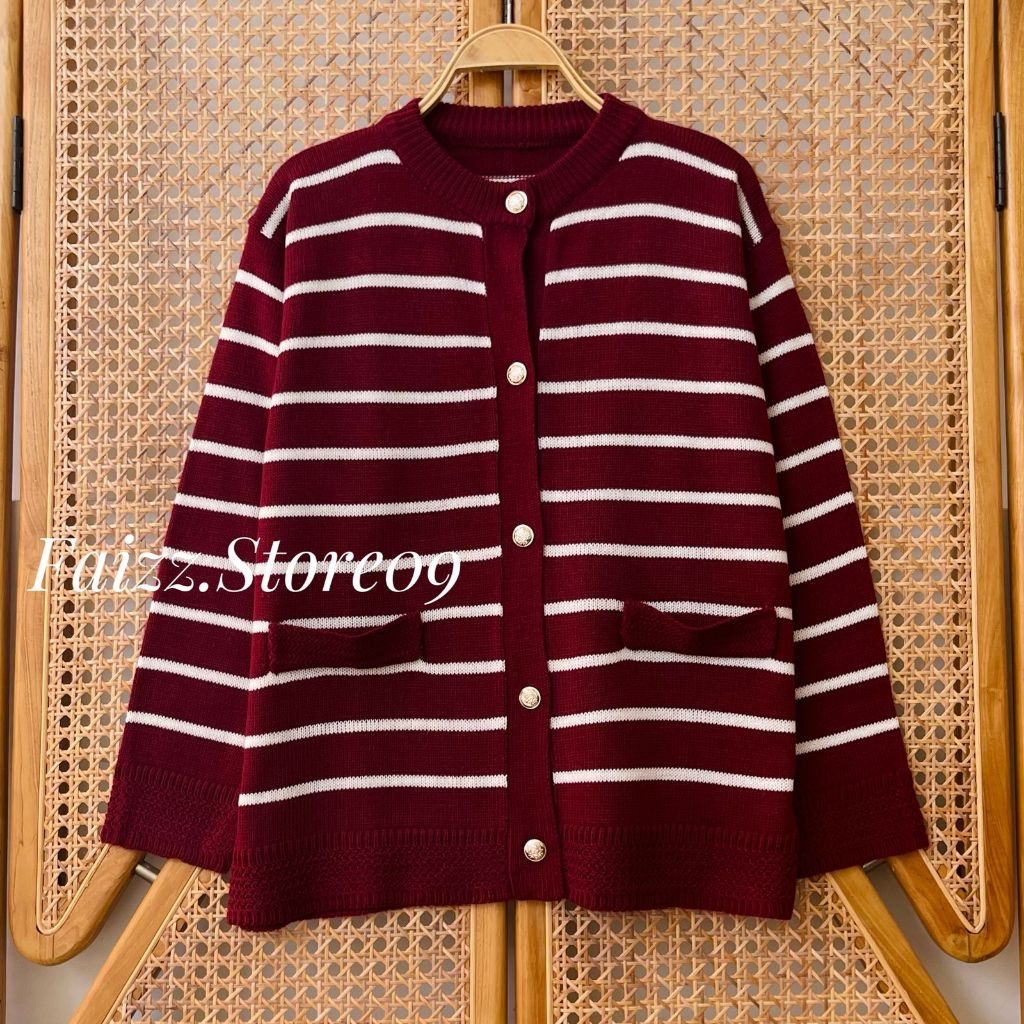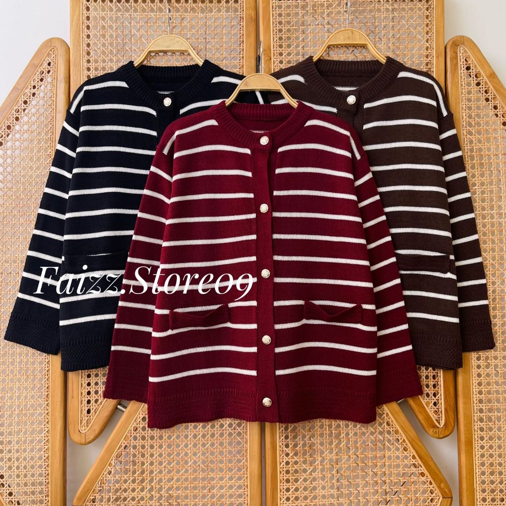 MAIMUN CARDY KNITWEAR - OUTER ATASAN CARDIGAN RAJUT WANITA KANCING MOTIF STRIPE KOREAN STYLE PREMIUM