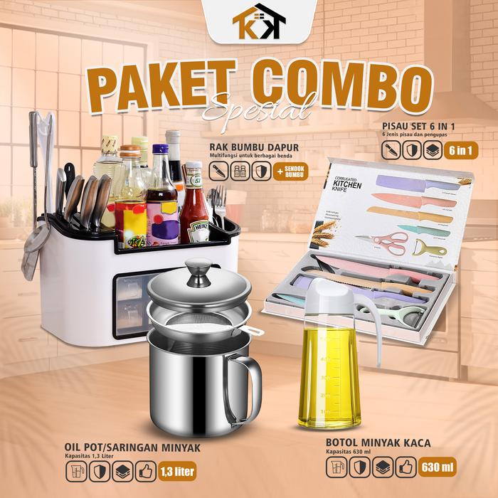 [Mall] (KK) COMBO KITCHENWARE RAK BUMBU DAPUR FREE SENDOK + OIL POT SARINGAN MINYAK STAINLESS + BOTOL MINYAK KACA 630ML