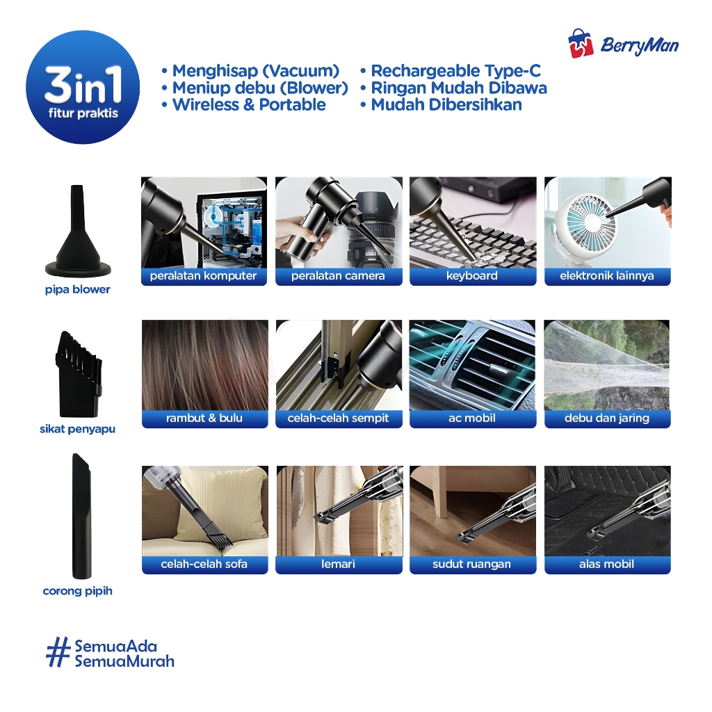 Vacuum Cleaner Mobil 3in1 Mini Portable Tanpa Kabel Rechargeable Multifungsi