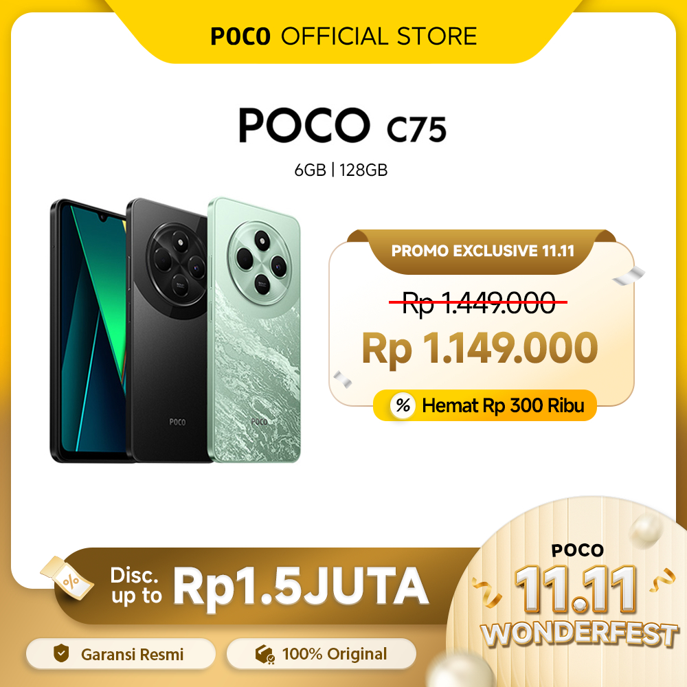 POCO C75 6/128GB 8/256GB Layar 6,88" 50MP AI Refresh rate 120 Hz Baterai 5.160mAh 18W Pengisian cepat RAM hingga 16GB dengan fitur ekspansi NFC Garansi 15 bulan