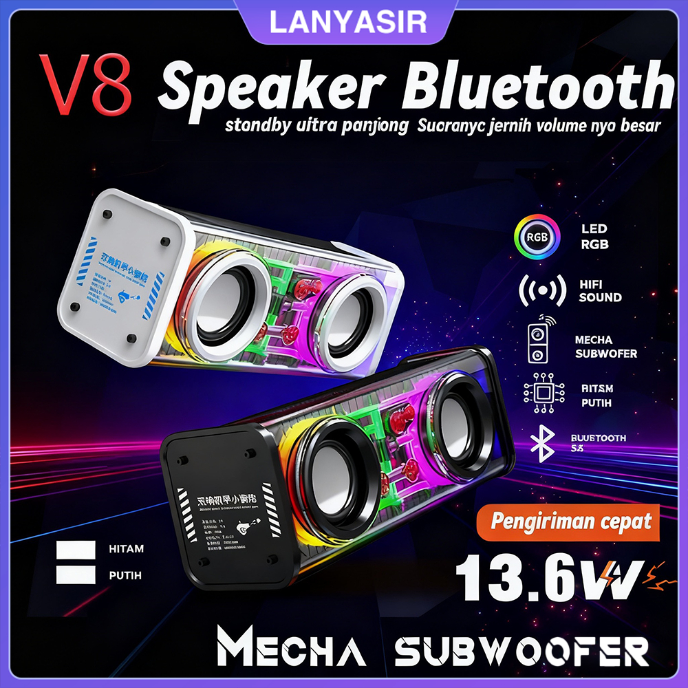 Speaker Bluetooth V8 Led Portable Dual Led Transparan 136w Bass