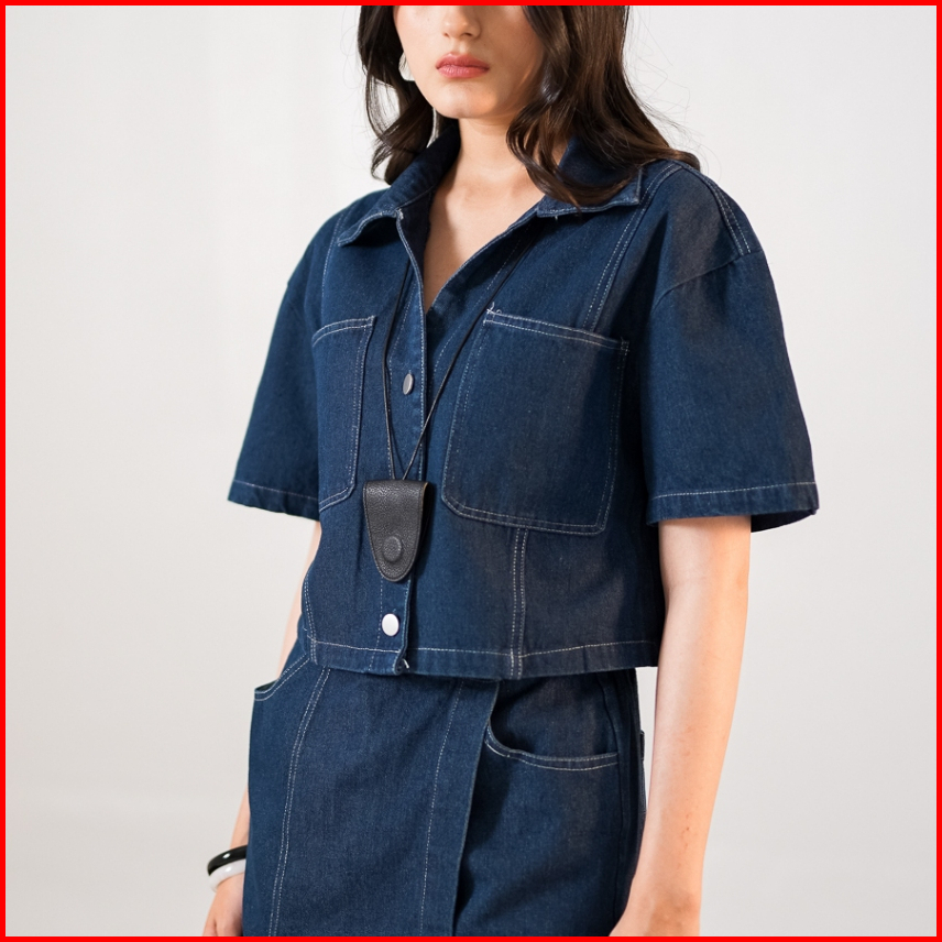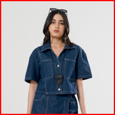 This Is April Demian Croptop Kemeja Denim V-neck Lengan Pendek