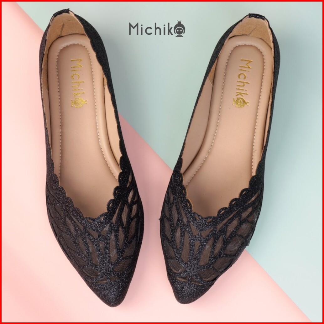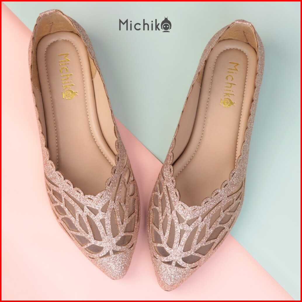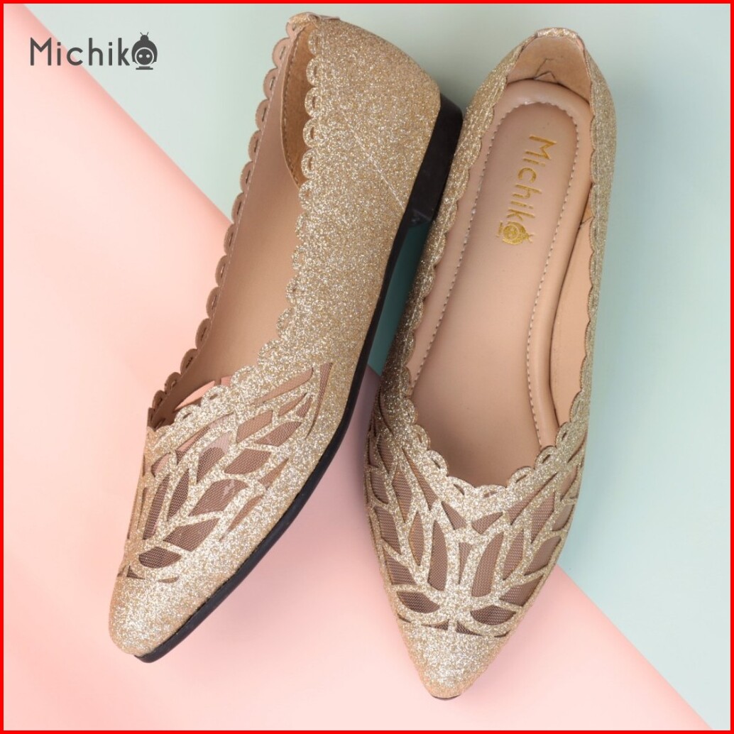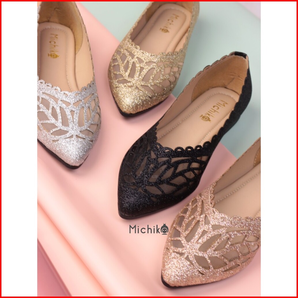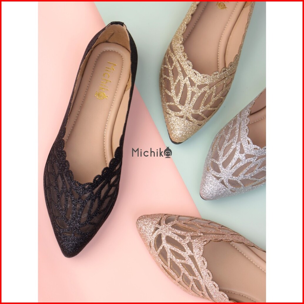 Sepatu Pesta Wanita Flatshoes Glitter Motif Daun