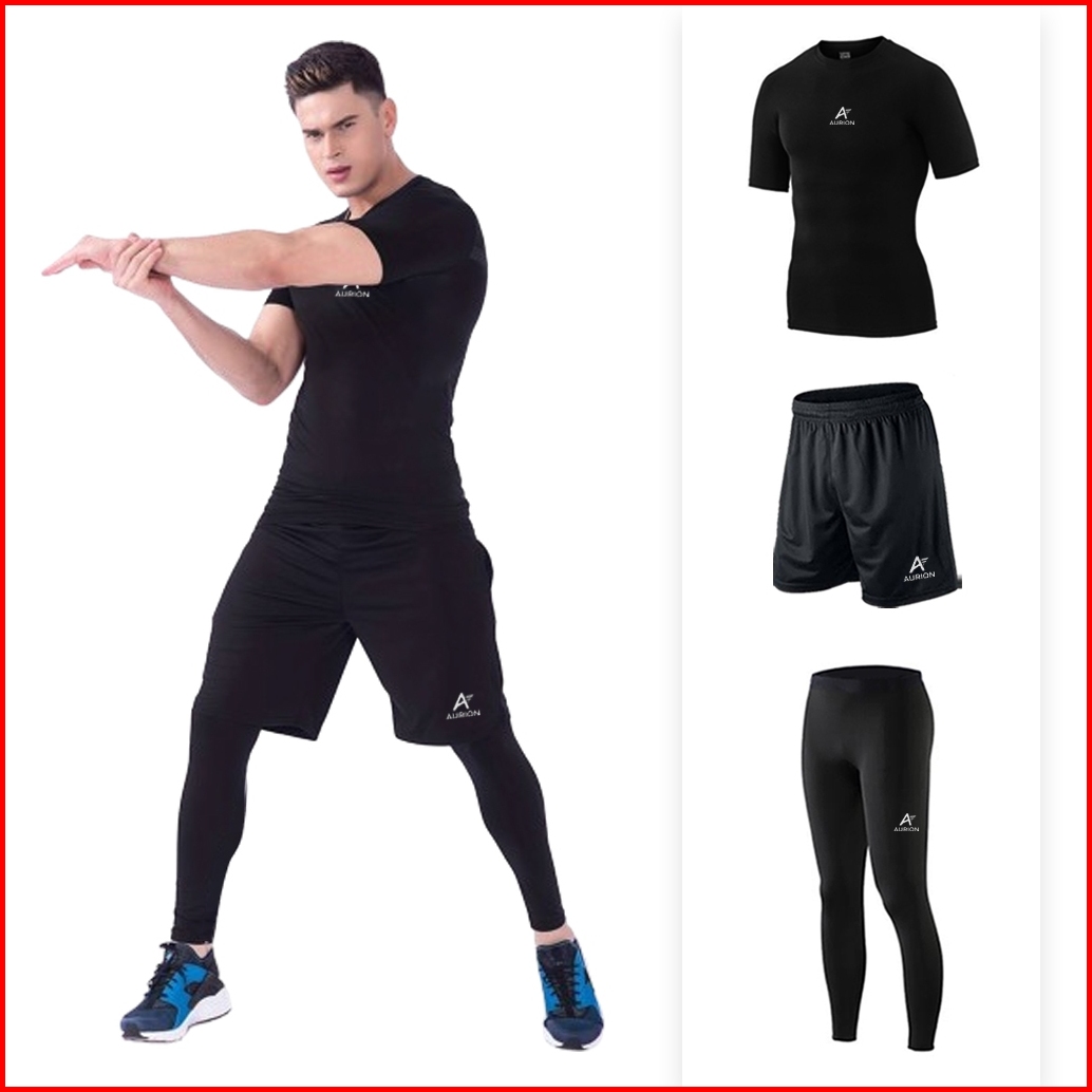 Aurion Setelan Baselayer Manset Lengan Pendek Celana Pendek Dan Legging Olahraga Pria Wanita
