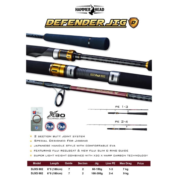 HAMMERHEAD Joran Pancing DEFENDER JIG Type Spinning Bahan Carbon X30 Full Fuji 180CM PE3 PE4 Untuk