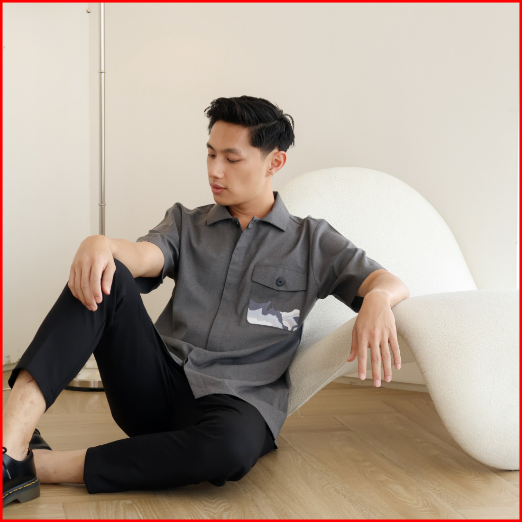 Kemeja Pria Lengan Pendek Premium Motif Ombak Bordir Kantong Glacier Dark Grey By Kinkami
