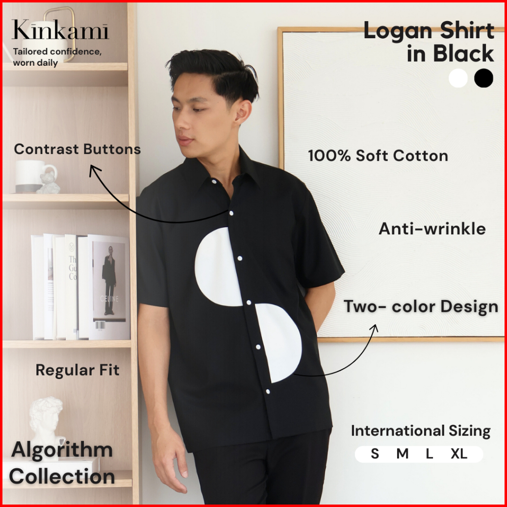 Kemeja Pria Lengan Pendek Premium Hitam Putih Motif Lingkaran Logan Black By Kinkami