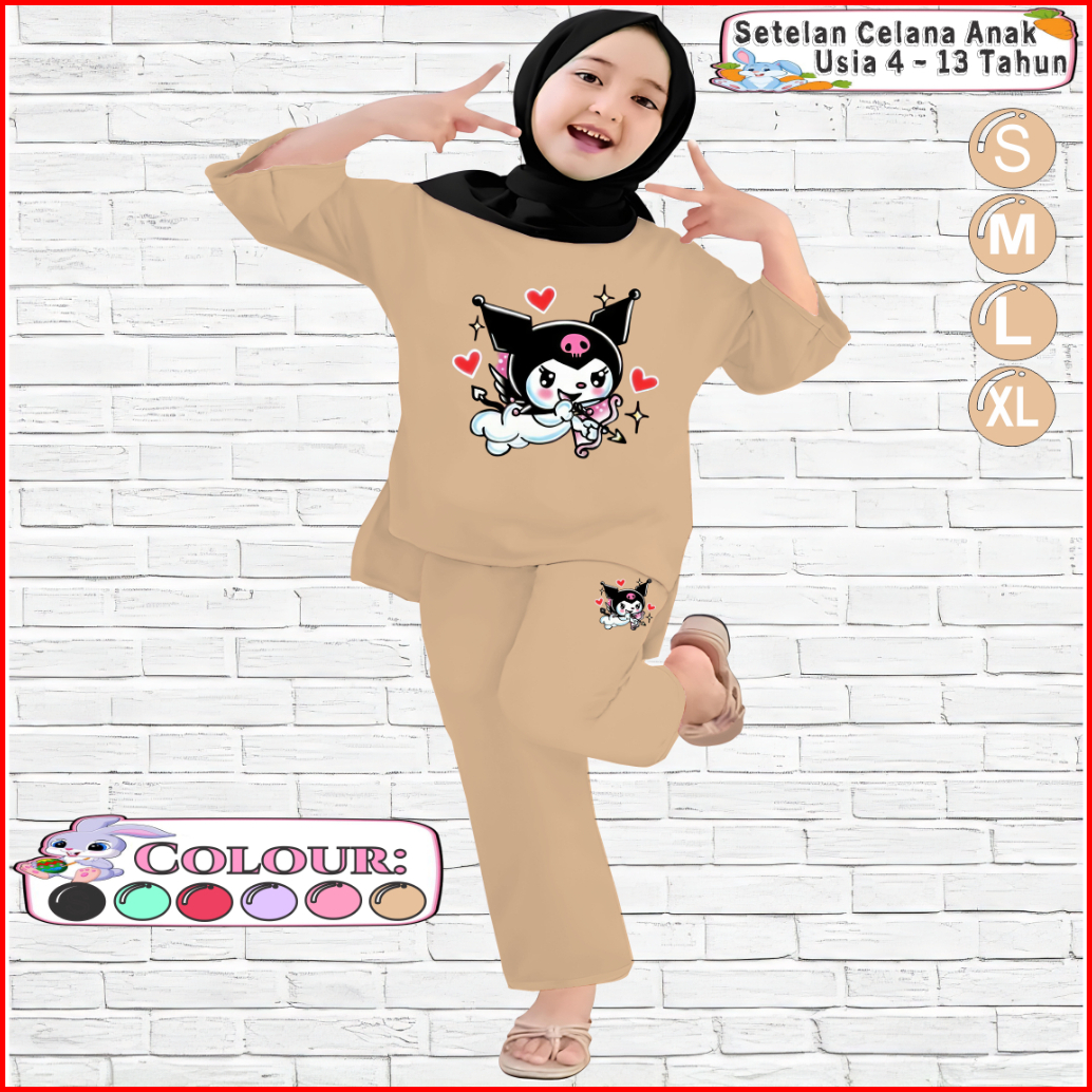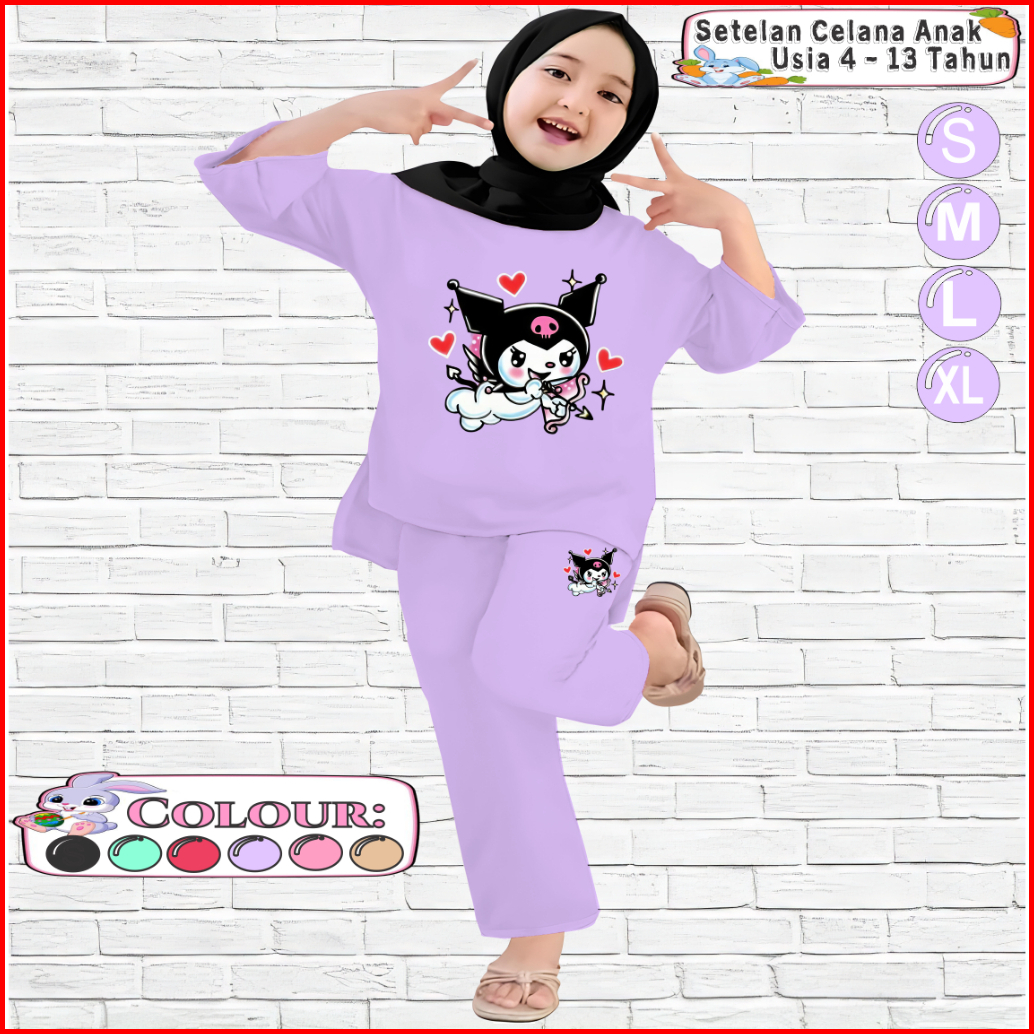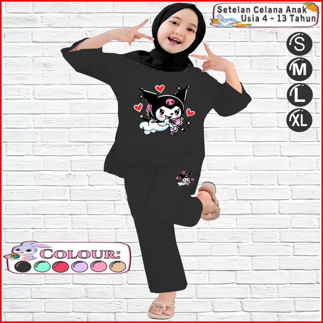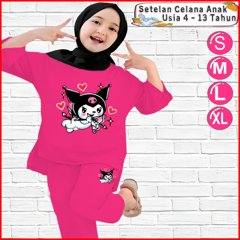 Setelan Kaos Anak Perempuan Celana Panjang 4-13 Tahun Motif Kuromi Bowlove