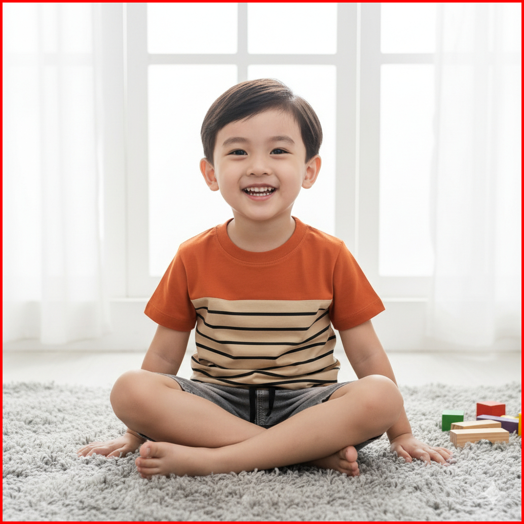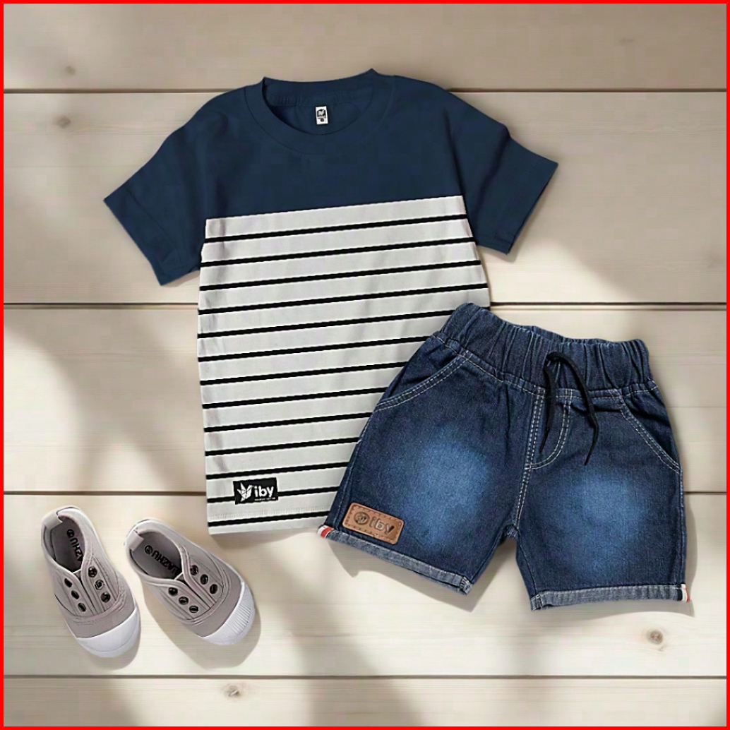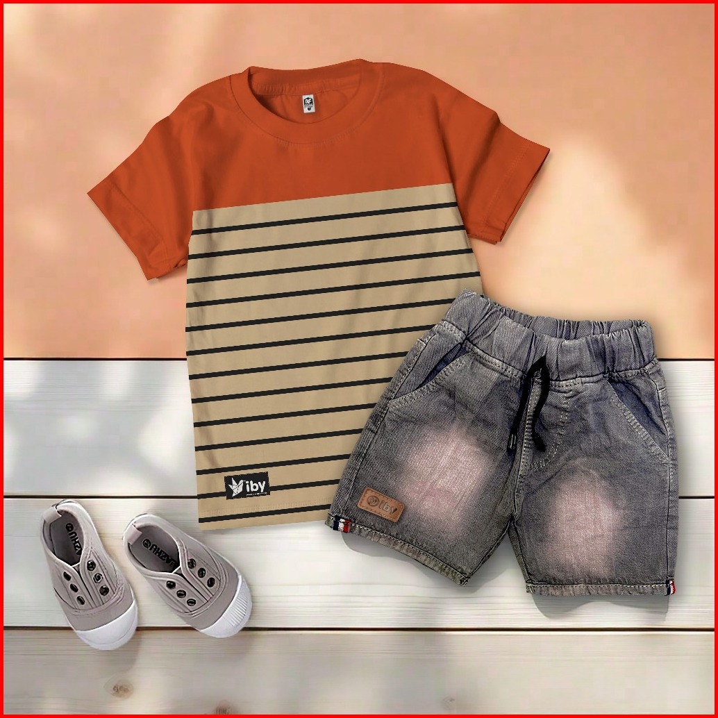 Almont Garis Kaos Anak Laki-laki Celana Jeans Pendek Outfit Kasual