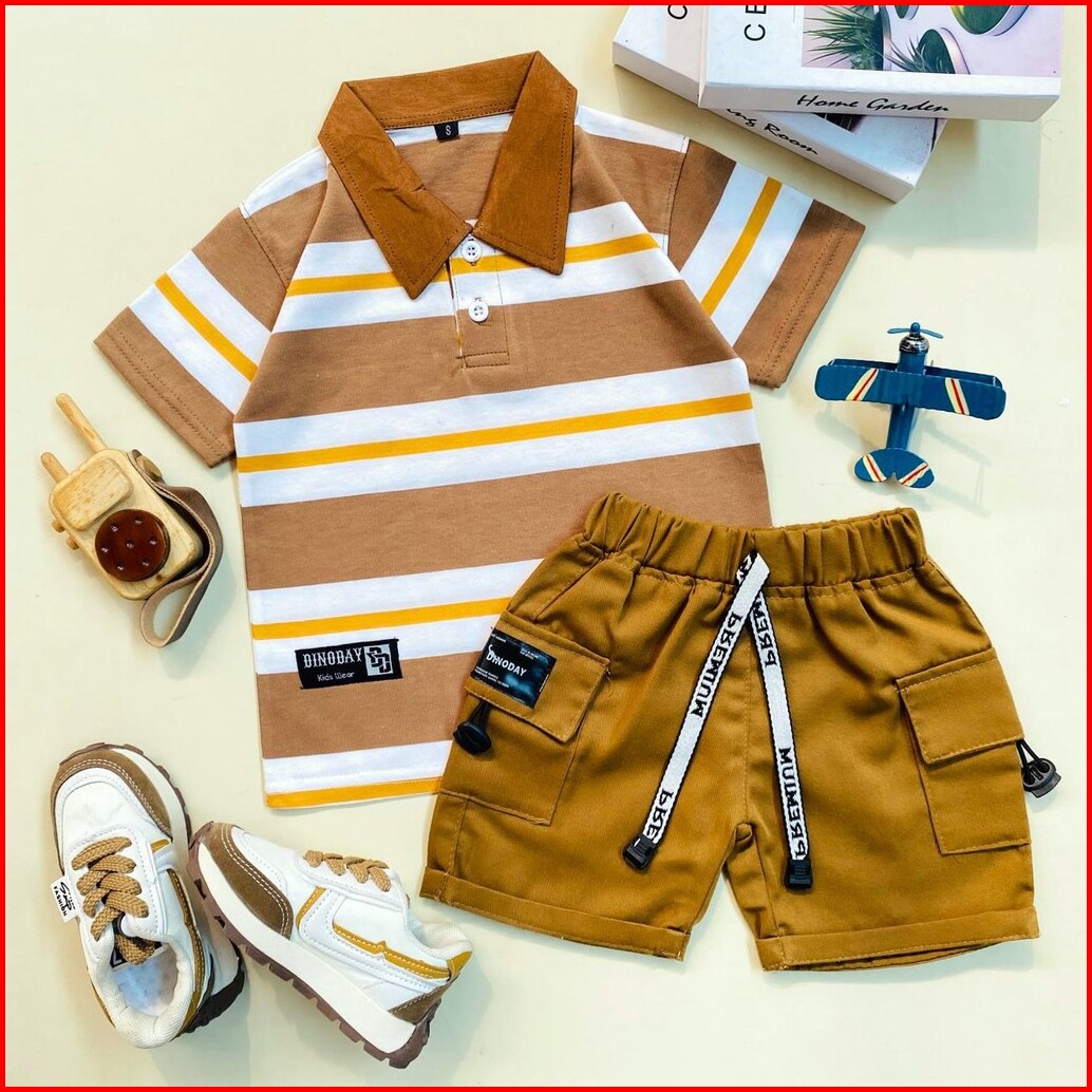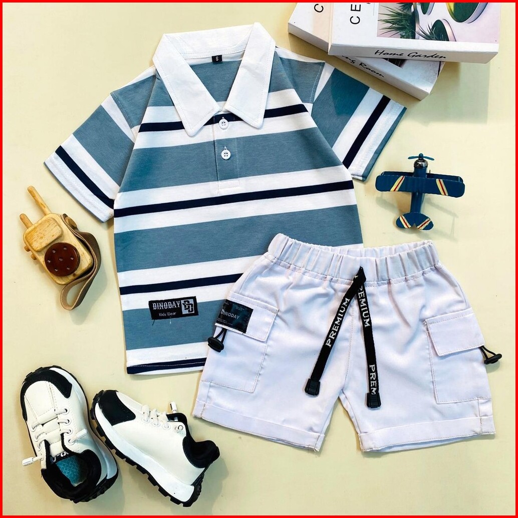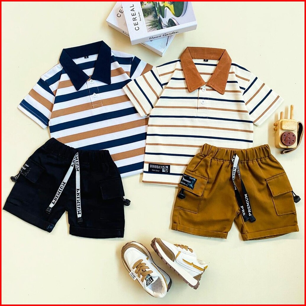 Estishop X Dinoday Setelan Baju Anak Laki Laki Perempuan Kerah Salur Celana Jeans Pendek 1-7 Tahun