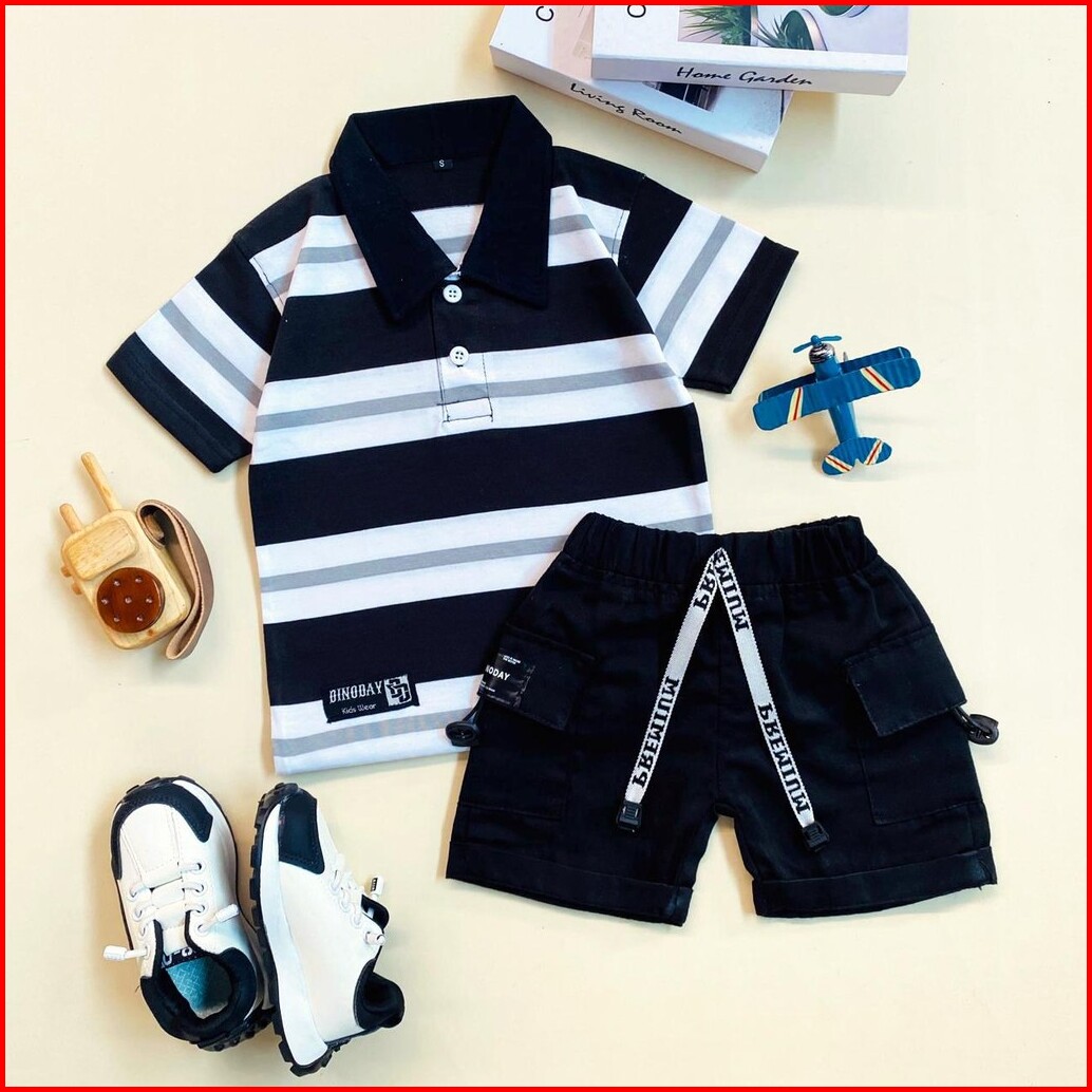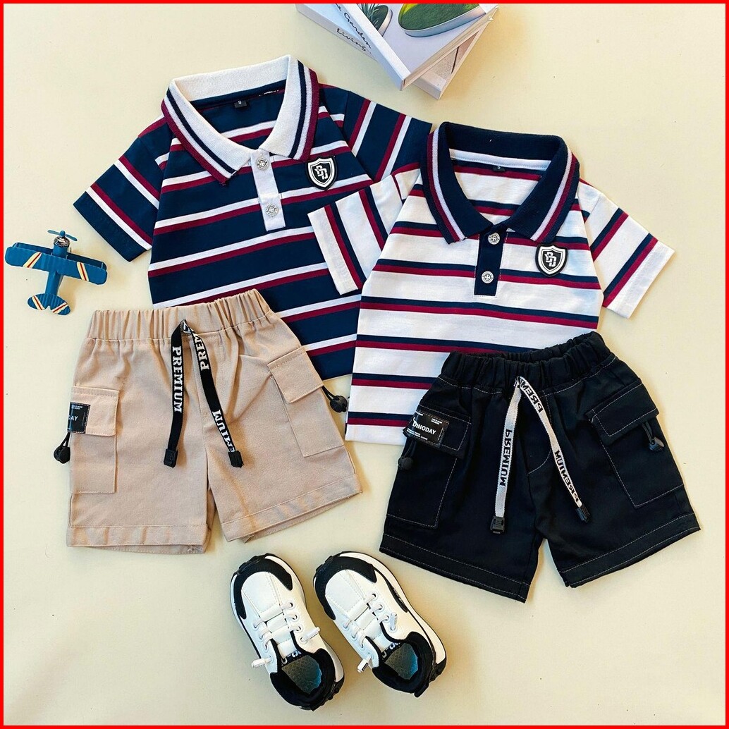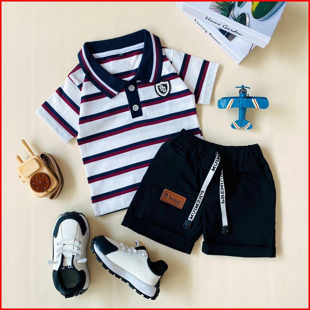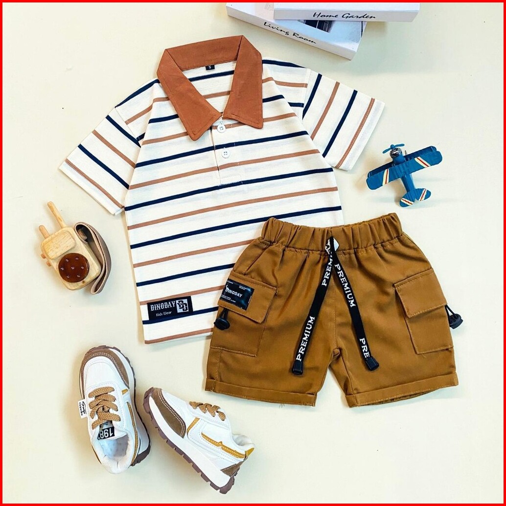 Estishop X Dinoday Setelan Baju Anak Laki Laki Perempuan Kerah Salur Celana Jeans Pendek 1-7 Tahun