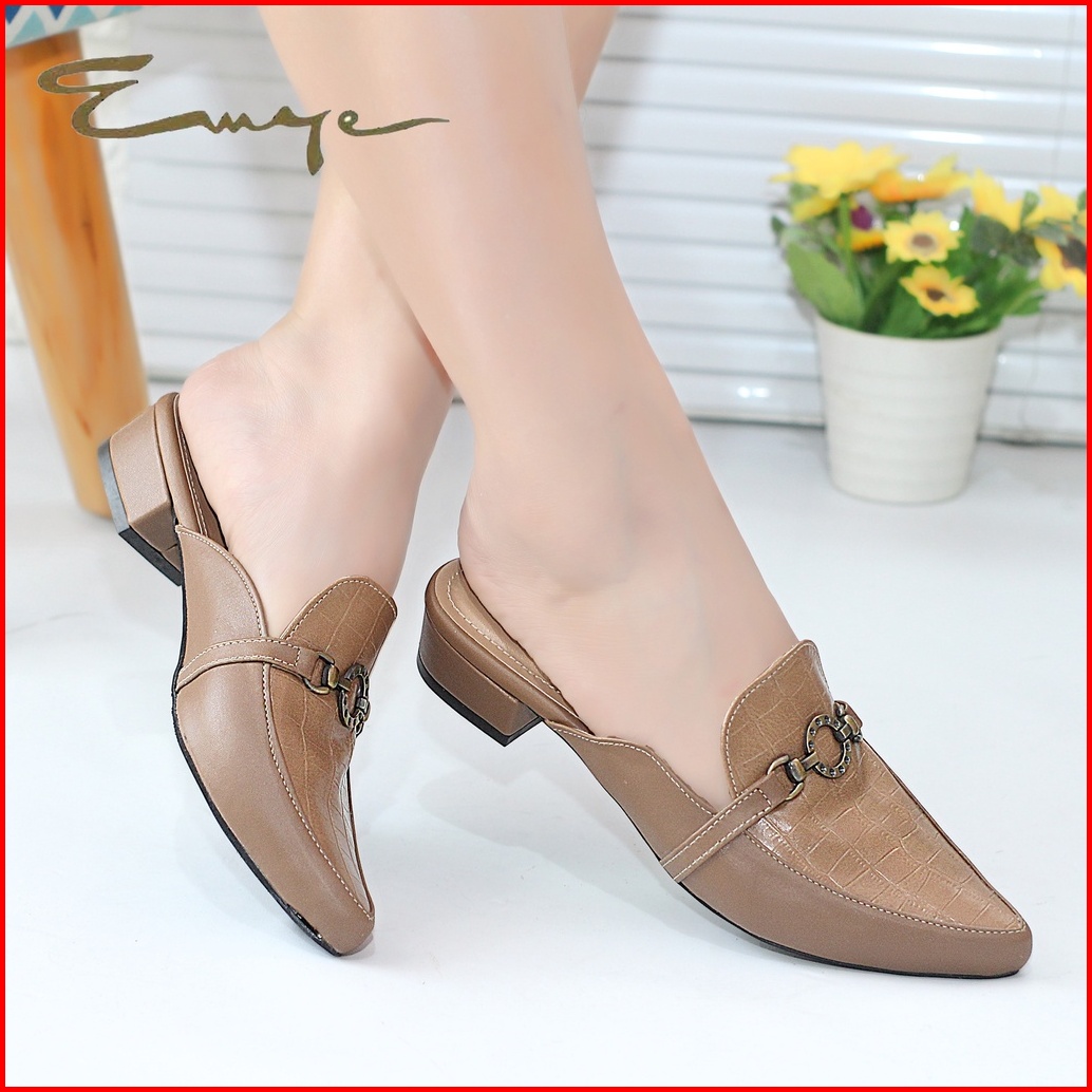 Emye - Sepatu Sandal Mules Wanita Flat Brown Hitam Cream Dahlia Motif