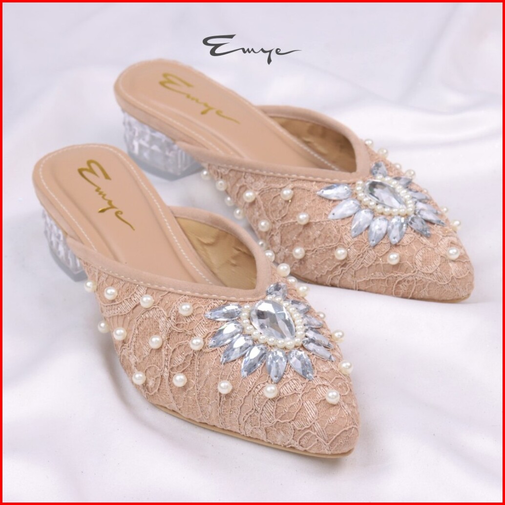 Emye - Sandal Slop Pesta Brukat Payet Wanita Mules Hak Kaca Hak 3cm