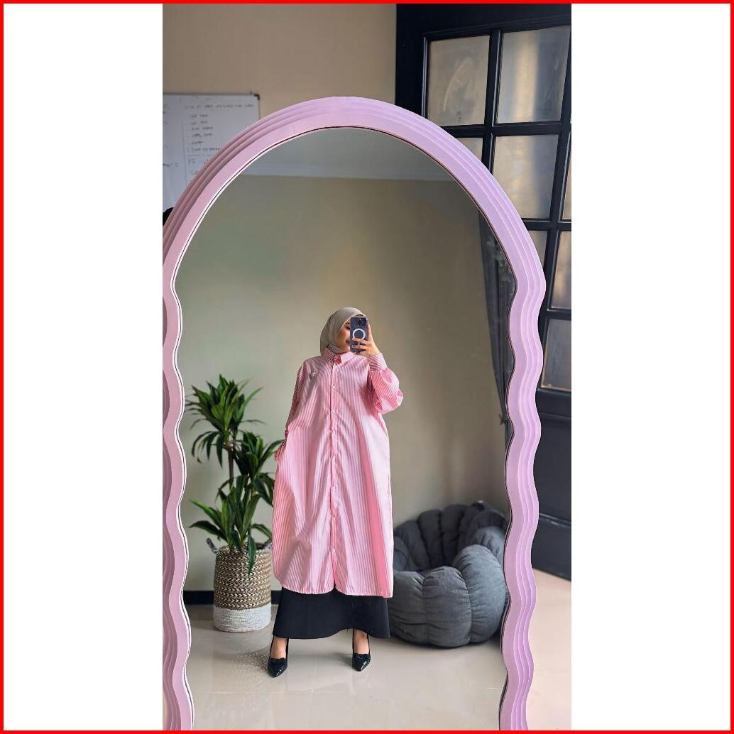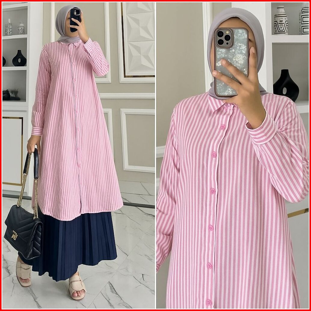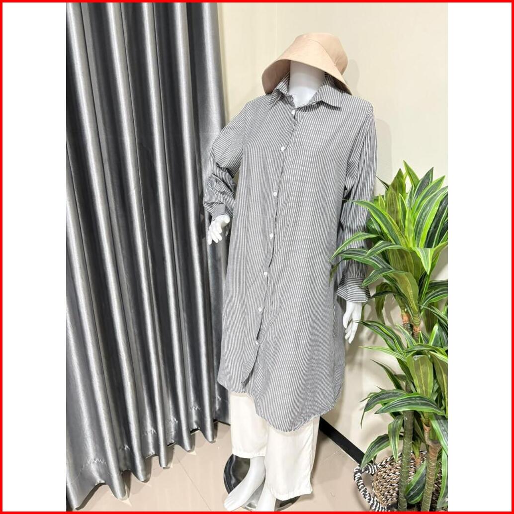 Poppy Tunik Atasan Wanita Muslim Baju Kerja Kuliah Panjang Polos Garis Katun Poplin Premium Lengan Manset
