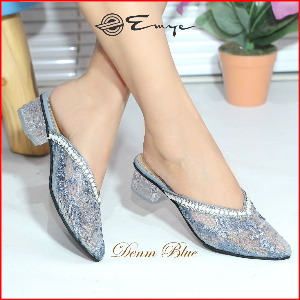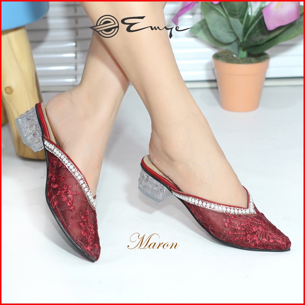 Emye - Sandal Mules Pesta Wanita Hak Kaca 4cm Brukat Payet Mutiara Transparan Hak Tahu Kaca Untuk Wedding Dan Kondangan