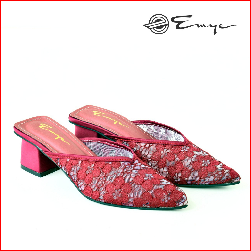 Emye - Sandal Mules Pesta Wanita Brukat Transparant Hak 5cm Hitam Cream Maron