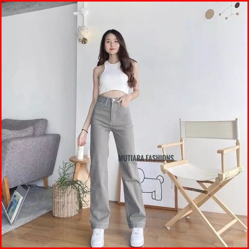 Teruwuw Celana Jeans Wanita Highwaist Kulot Wanita Panjang Jins Loose Korea Jeans Mutiara Jeans