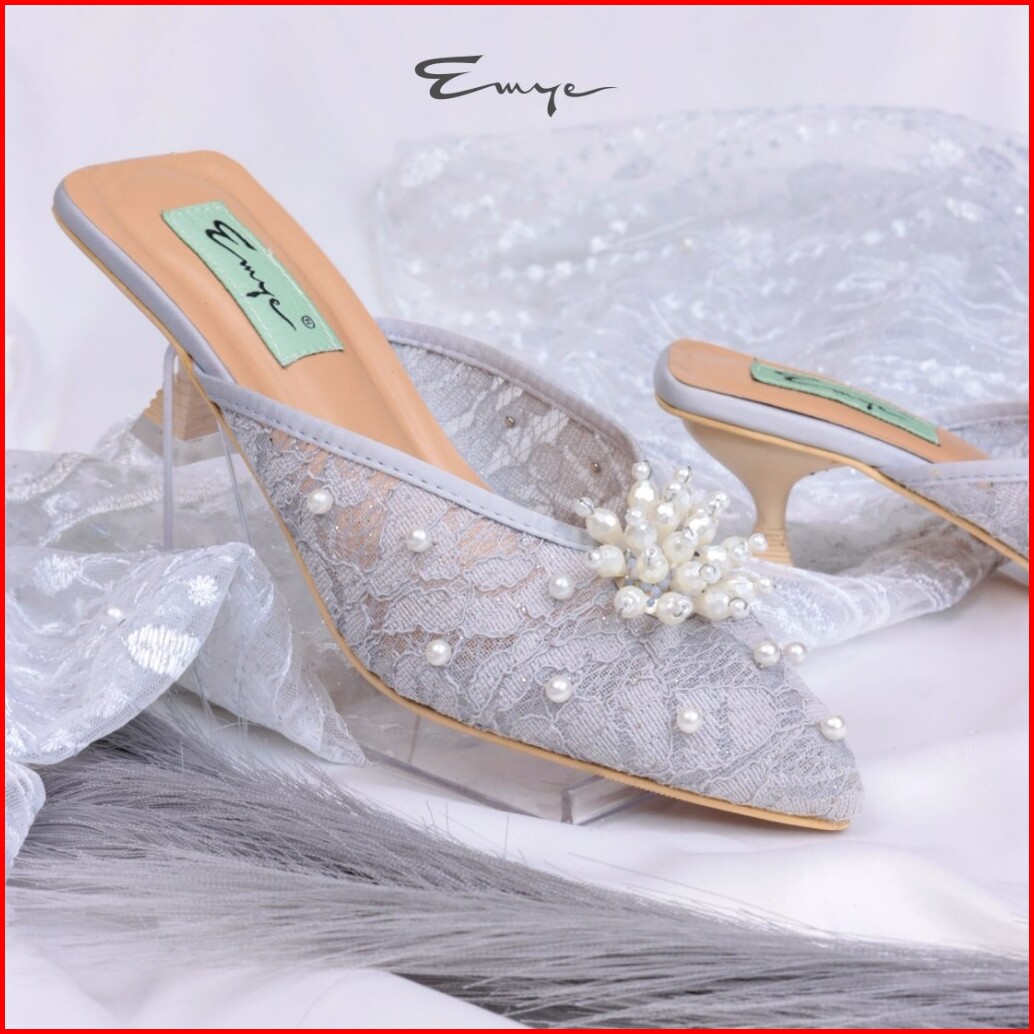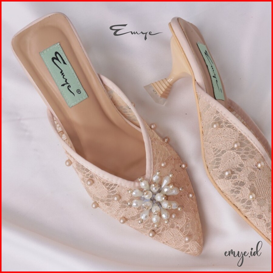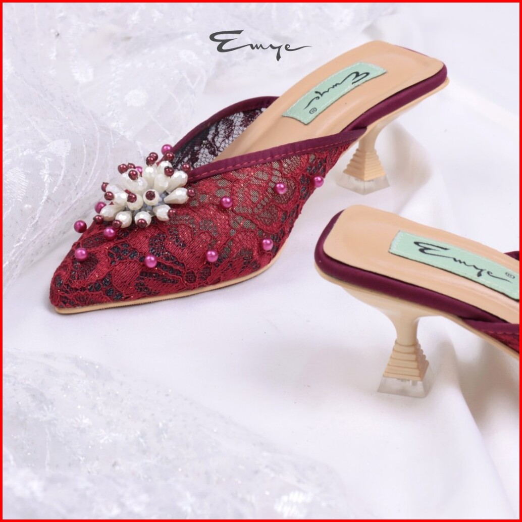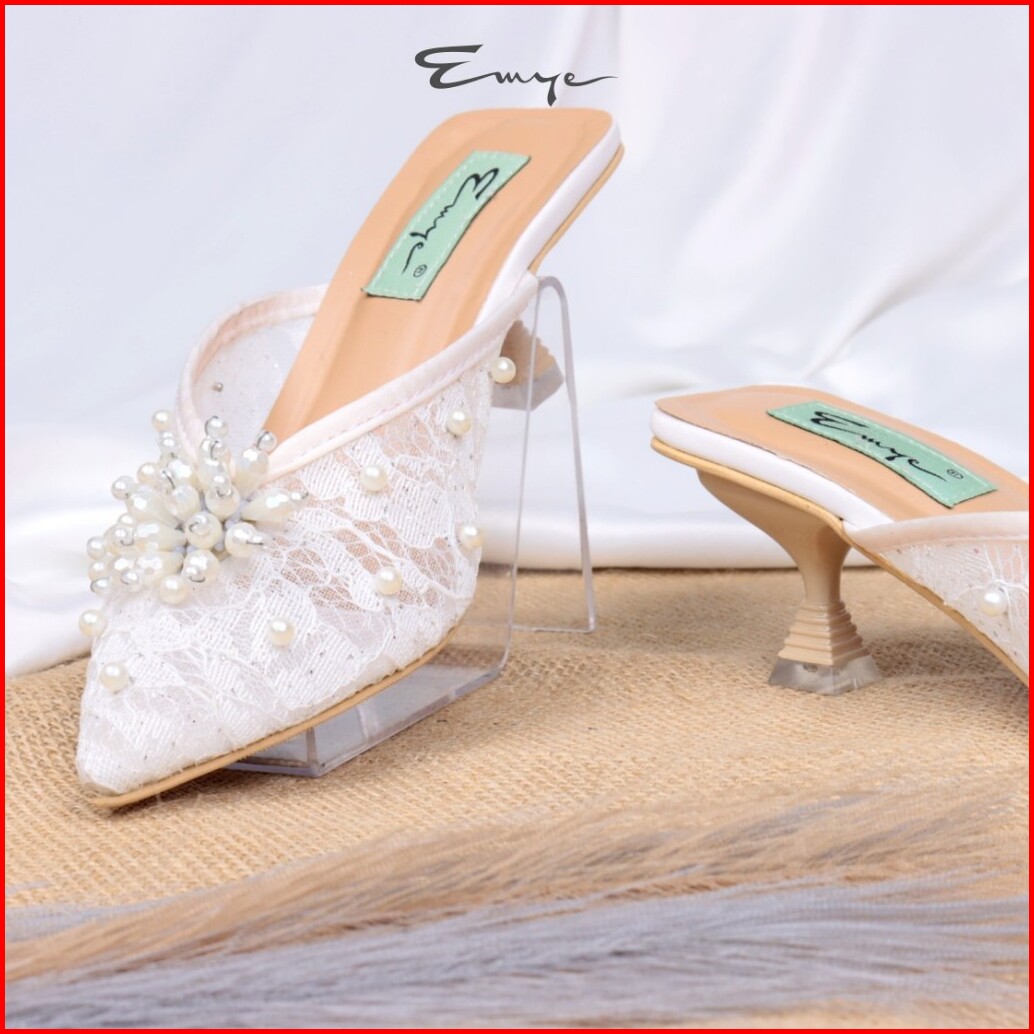 Emye - Sandal Heels Mules Pesta Wanita Brukat Transparant Payet Hak Lancip 36-41