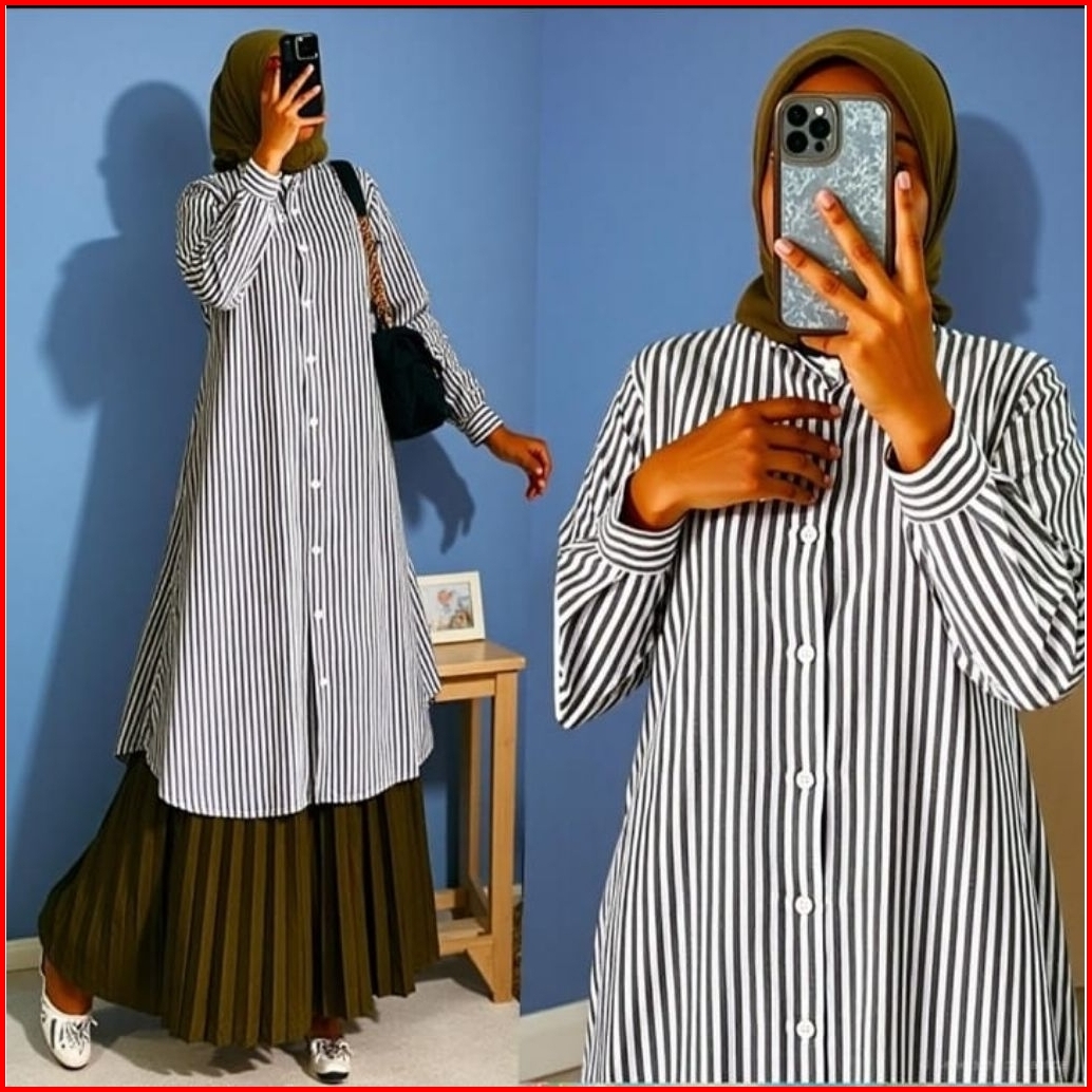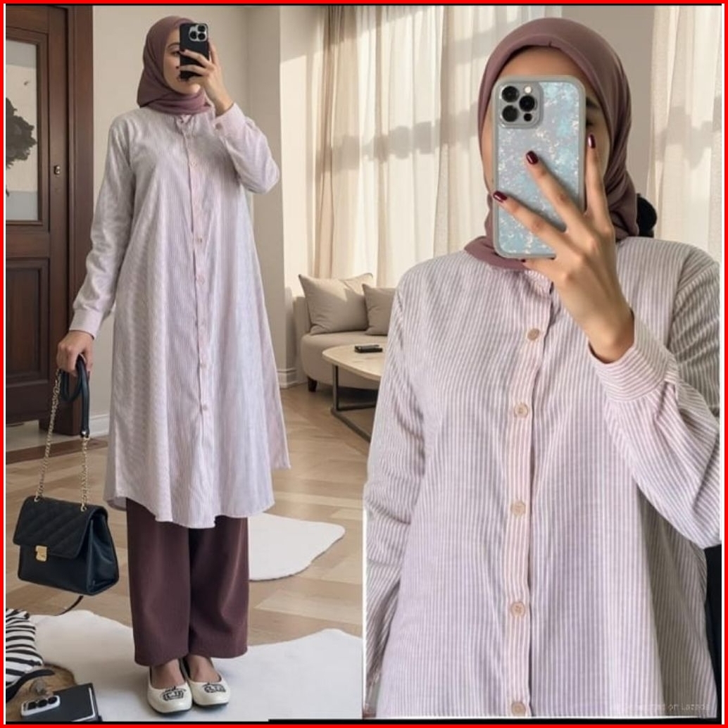 Poppy Long Tunik Outfit Baju Atasan Wanita Muslim Tunik Kerja Kuliah Kemeja Panjang Polos Salur Katun Premium