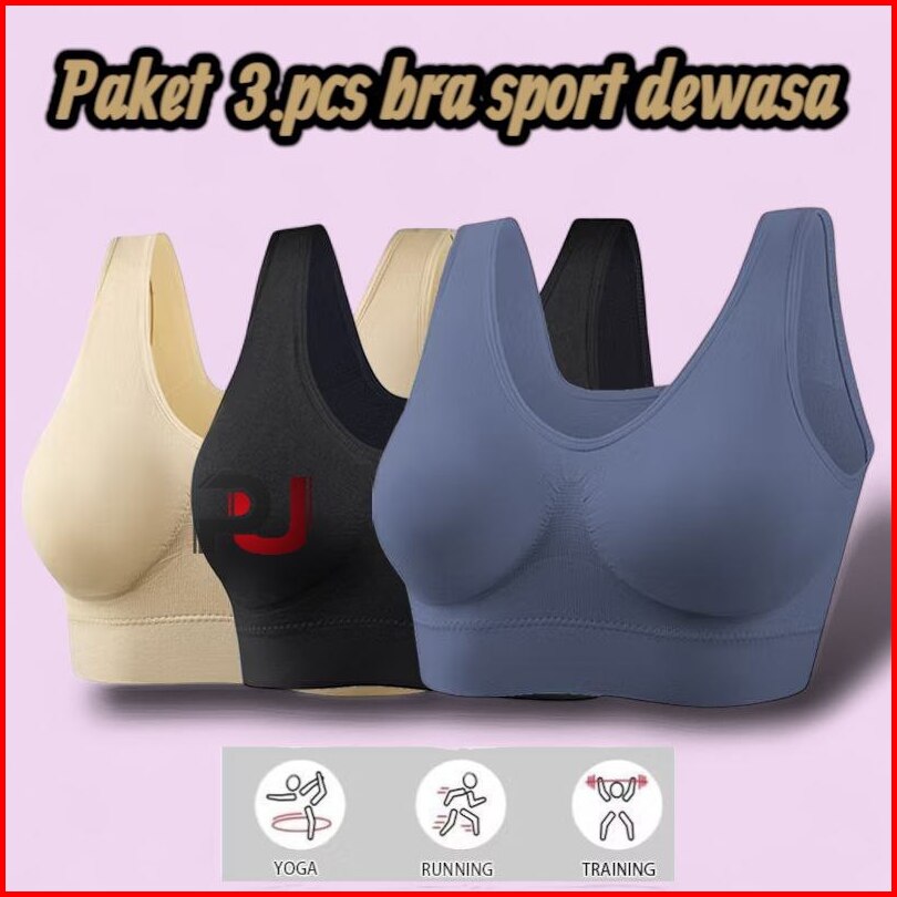 Isi 3pcs Bra Sport Tanpa Busa Jumbo Wanita Tanpa Kawat Olahraga Busa Push Up Elastis Bh Tank Top Olahraga Wanita