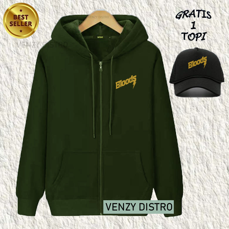 BONUS TOPI... Jaket Resleting Zipper Bloods Text Gold Premium Quality Sweater Tulisan Sweater Kata-Kata Hoodie Sablon