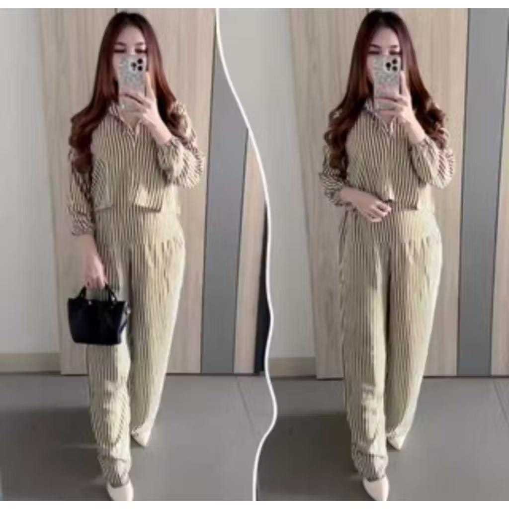 SET PANJANG MOTIF GARIS SALUR BAJU SETELAN WANITA ATASAN CELANA KULOT CASUAL REMAJA KEKINIAN TERBARU