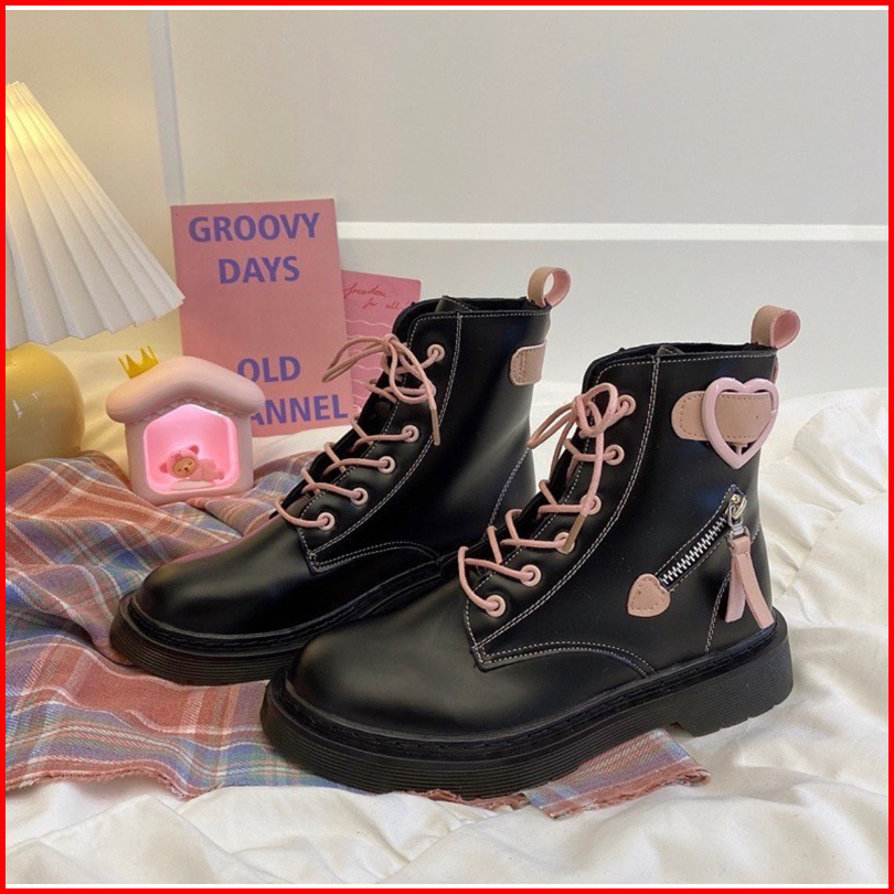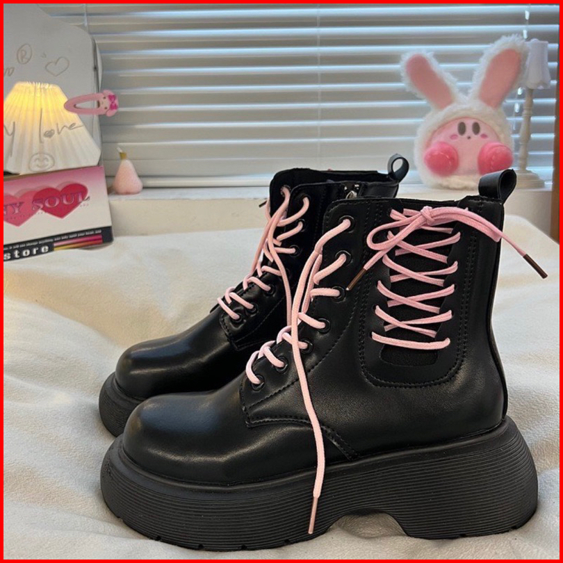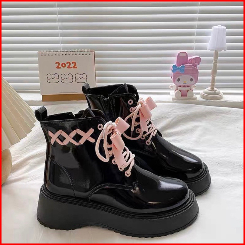 Ready Stock Pink Power Boots Sepatu Leather Hitam Lucu Gaya Model Wanita Korea