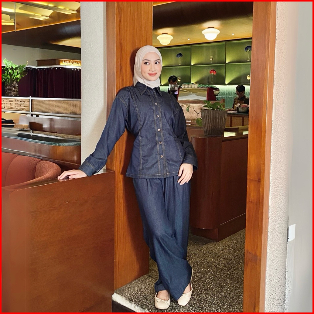 Moru Kein - Sora One Set Atasan Denim Wanita Kemeja Cewek Fit Body Celana Panjang Cullote Jeans