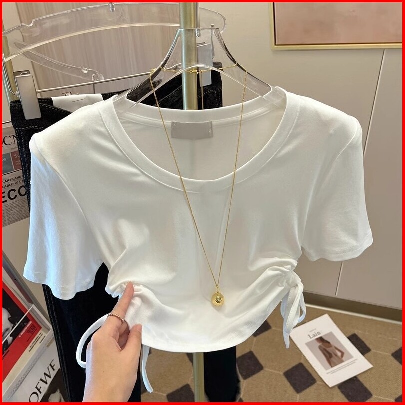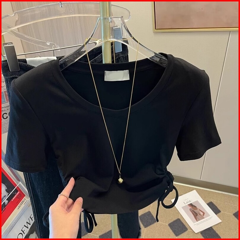 Kaos Polos Crop Wanita Kaos Berkerah V T-shirt Leher Kru Pendek Bertali Kaos Berwarna Kaos Merah Muda