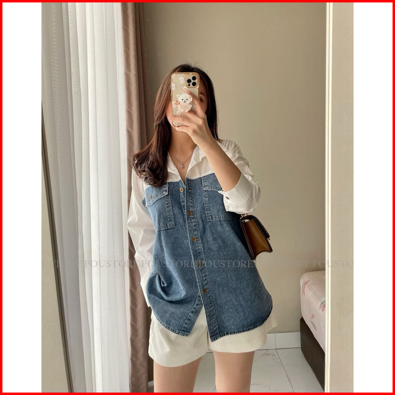 Blouse Denim Mix Cotton Poplin Premium Korean Minimalis