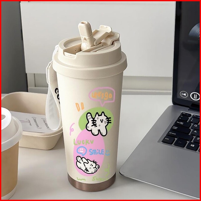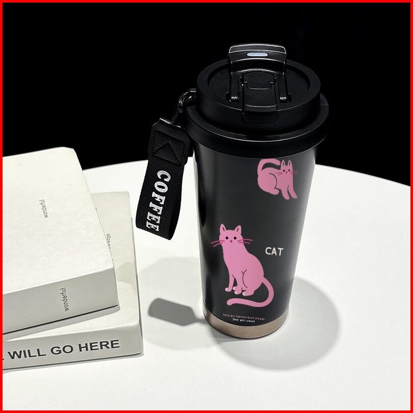 Tumbler Coffee Mug Stainless Custom Steel Dengan Tali Cup 500 Ml Cute Kartun Cat
