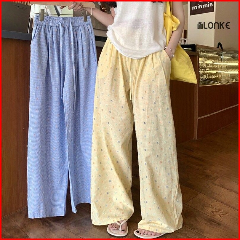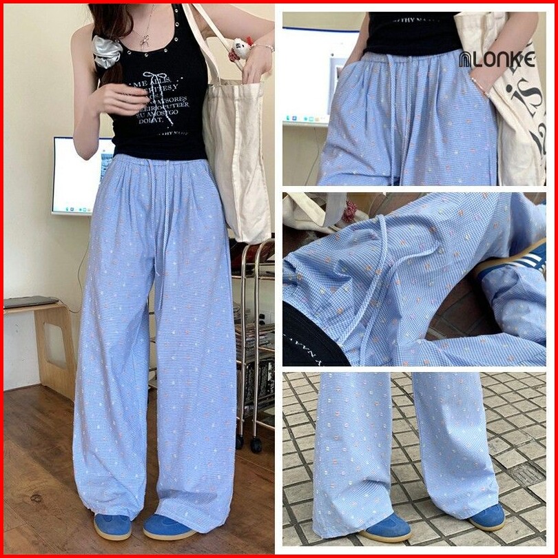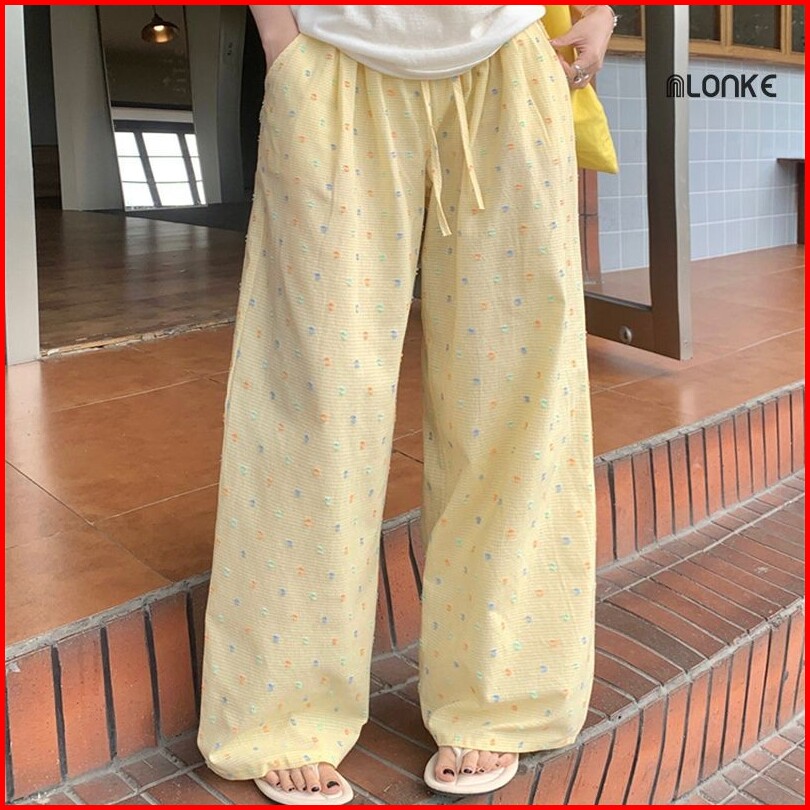Nlonke - Celana Serut Celana Lebar Polkadot Bertekstur Kotak-kotak Celana Wanita Kaki Lurus Kasual