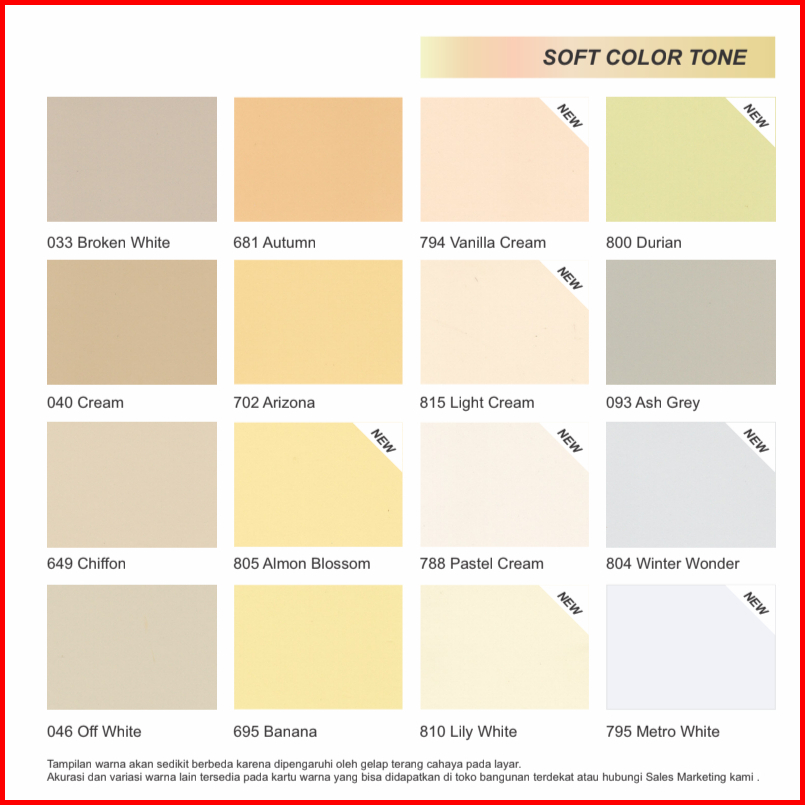 Cream (040), Off White (046), Chiffon (649), Smoke Grey (665), White(6000), Mellon Green (713), Banana (695), Palmyra (803), Broken White (033), Super Black (w678), Bright Blue (801), Orange Passion, Geranium (799), Blossom Pink (689), Winter Wonder (804), Pure Grey (811), Cashmere Blue (611), Alpine Blue (685), Gentle White (761), Vanilla Cream (794), Lemon Drop (605), Acapulco (789), Almon Blossom (805), Apple White (793), Arizona (702), Ash Grey (093), Athena Green (808), Atlantis Blue (704), Autumn (681), Barley White (777), Bluebell White (797), Briliant White (760), Coral Spring (609), Daisy (682), Durian (800), Fairy Tale (682), Gardenia (796), Herbal Green(813), Hula Hoop (791), Light Cream (815), Lily White (810), Lyric Teal (814), Metro White (795), Miranda (807), Orange Berry (701), Pasific Sea (705), Pastel Cream (788), Pepper Green (789), Saddle Brown (812), Shore Blue (792), Sunflower (802), Super White (786), Tangerin (790), Tropical Green (683), Whisper White (711), Wonder Beige (806), Yellow Canary (787)
