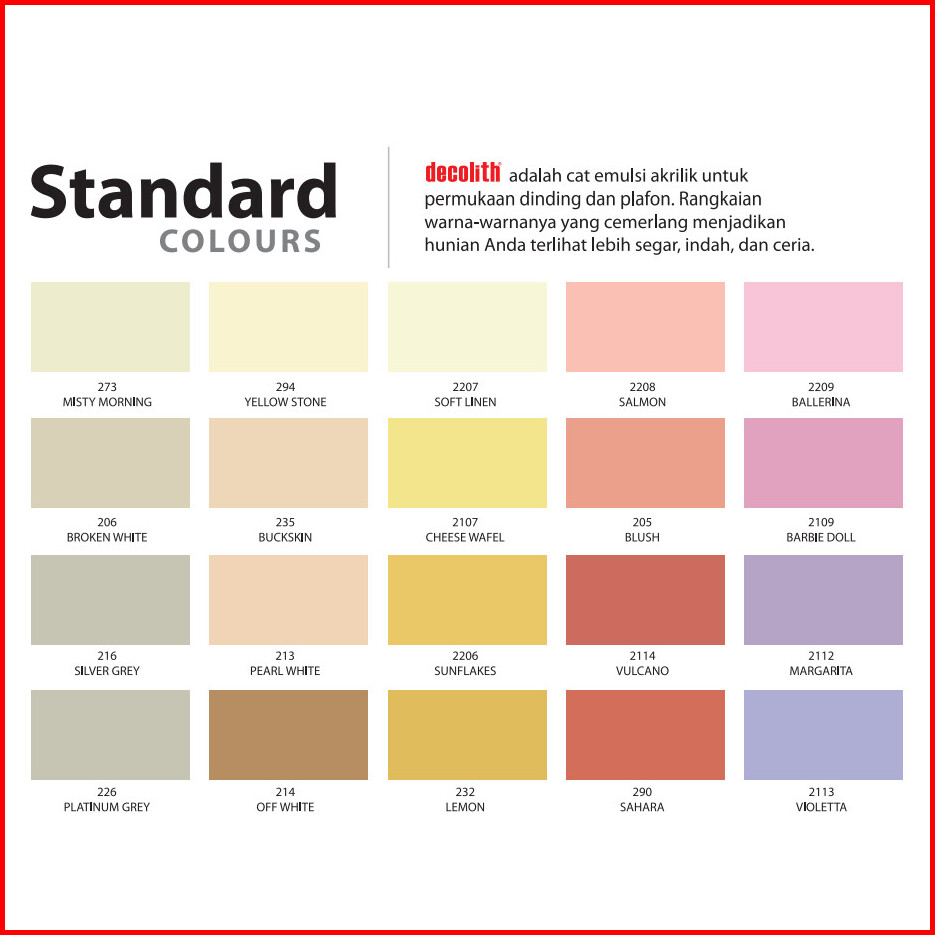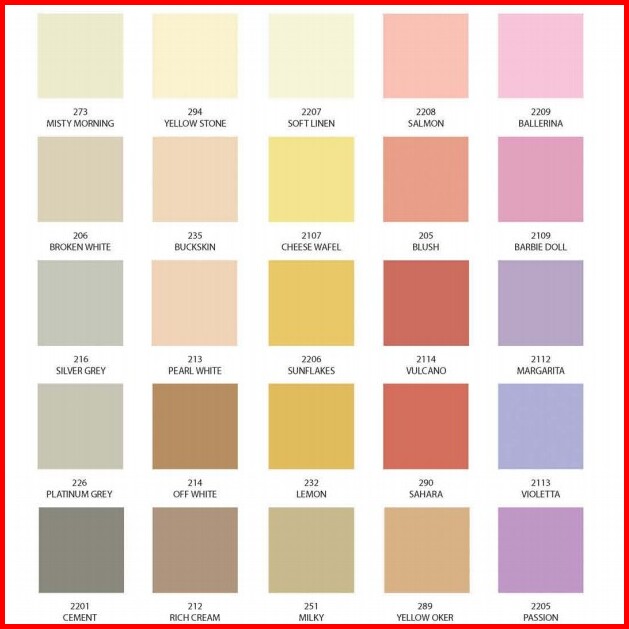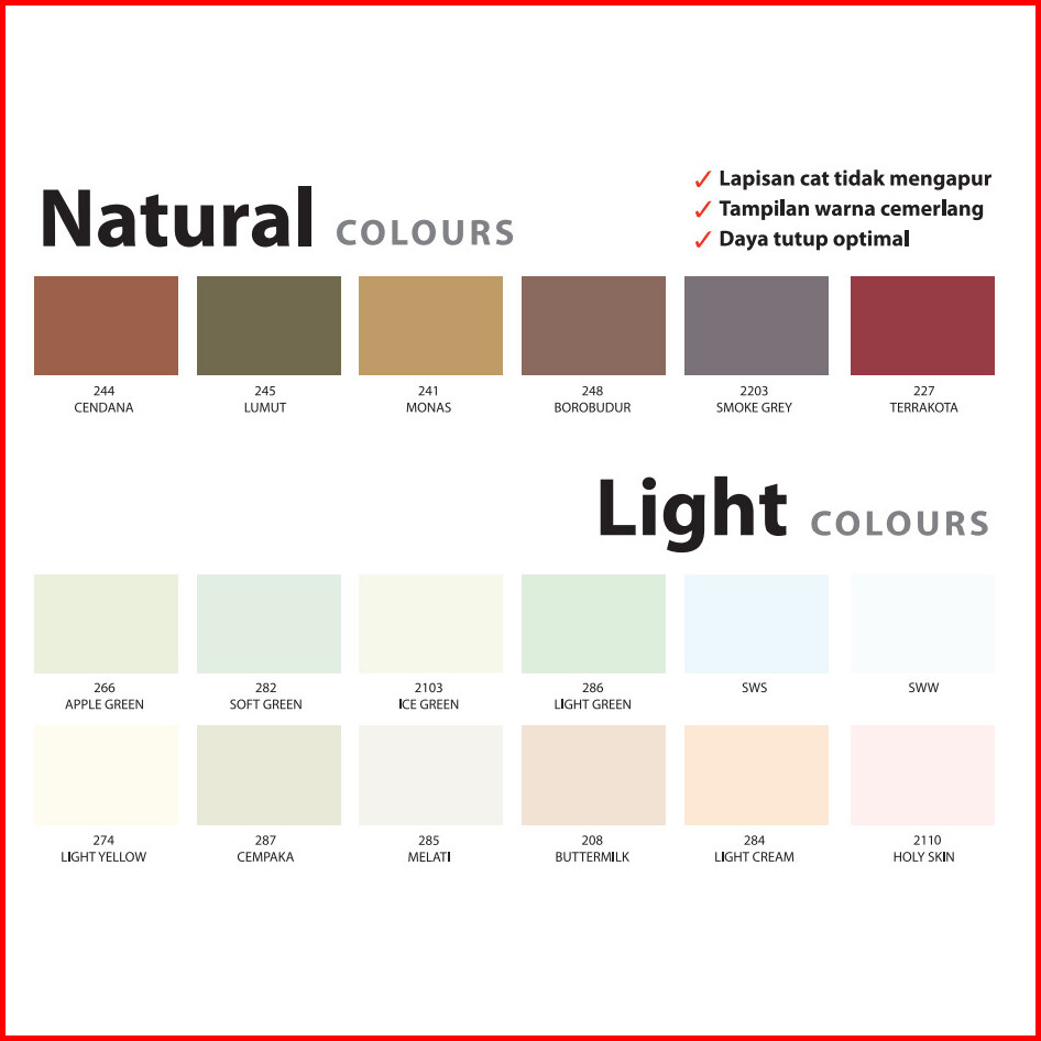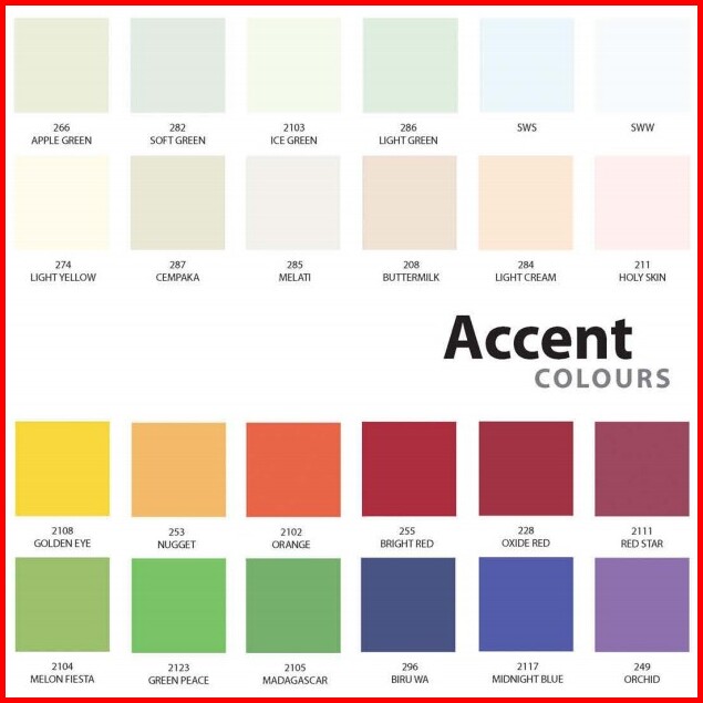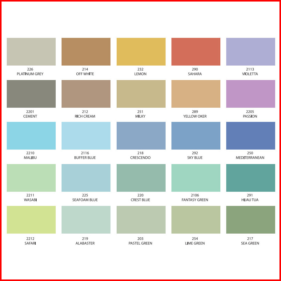 Putih SW, Putih SWS, 203 Pastel Green, 205 Blush, 206 Broken White, 208 Buttermilk, 2103 Ice Green, 2107 Cheese Wafel, 2109 Barbie Doll, 2111 Red Star, 2112 Margarita, 2114 Vulcano, 212 Rich Cream, 2201 Cement, 225 Seafoam Blue, 236 Willow, 242 Nusa Indah, 245 Lumut, 248 Borobudur, 249 Orchid, 227 Terrakota, 232 Lemon, 241 Monas, 250 Mediterranean, 251 Milky, 254 Lime Green, 255 Bright Red, 273 Misty Morning, 286 Light Green, 289 Yellow Oker, 290 Sahara, 291 Hijau Tua, 296 Biru WA, 2102 Orange, 2206 Sunflakes, 2207 Soft Linen, 238 Merak