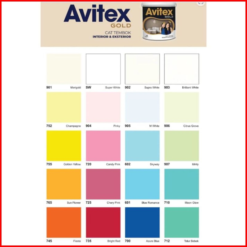 901 Marigold, SW Super White, 902 Supra White, 903 Brilliant White, 752 Champagne, 904 Pinky, 905 M White, 906 Citrus Grove, 755 Golden Yellow, 720 Candy Pink, 602 Skyway, 907 Minty, 765 Sunflower, 725 Cherry Pink, 601 Blue Romance, 745 Fiesta, 735 Bright Red, 700 Azure Blue, 712 Telur Bebek, 908 Moonstone, 909 Swan Wing, 910 Lilac White, 911 Reticent White, 912 Dreamland, 913 Peachy, 914 Creamy, 670 Artic Silver, 620 Apple Green, 831 Light Cream, 915 Teratai, 916 Dolphin Grey, 770 Emerald, 040 Cream, 917 Sandstone, 918 Minimalis Grey, 771 Kiwi Gold, 680 Safari, 919 Granite Grey, SB Super Black, 710 Moon Glow, Base A White Colour