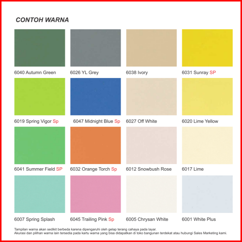 Autumn Green (6040), YL Grey (6026), Ivory (6038), Sunray (6031), Spring Vigor (6019), Midnight Blue (6047), Off White (6027), Lime Yellow (6020), Summer Field (6041), Orange Torch (6032), SnowbrushRose (6012), Lime (6017), Spring Splash (6007), Trailing Pink (6045), Chrysan White (6005), White Plus (6001), Bright Red (6033), ZinniaRuffles (6034), Bluegrass (6018), Fresh Lime (6029), Sashay Red (6043), Zinnia Scent (6022), Rosy Pink (6011), Sunshine (6042), Warley Rose (6023), Citrus Grove (6003), Dream Land (6008), ParadiseGreen (6030), Tiara (6036), Daupne Red (6046), Cerulean (6025), BouquetViolet (6035), Minimalis Grey (6037, Granite Grey (6015), Cascade (6004), Light Gingerly (6039, Straw (6028), Magic Purple (6024), All Gold (6021), Lavender (6006), Violet Petal (6013), Sunny Ivory (6009), Yellow Sunset (6010), Paperlace (6016), White (6000)