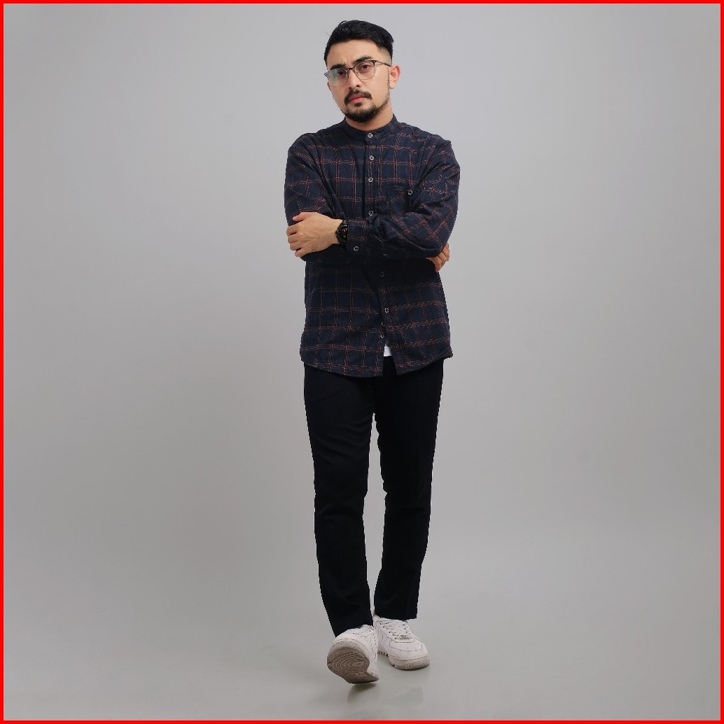 Dgm Kemeja Pria Flanel Kerah Sanghai Koko Lengan Panjang Premium Navy List Brown 2278