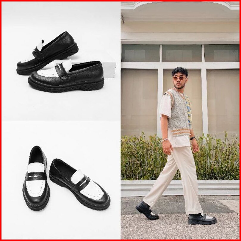 Sepatu Penny Loafers Kombinasi Docmart Tassel Dasi Putih Pria Wanita Formal Kasual