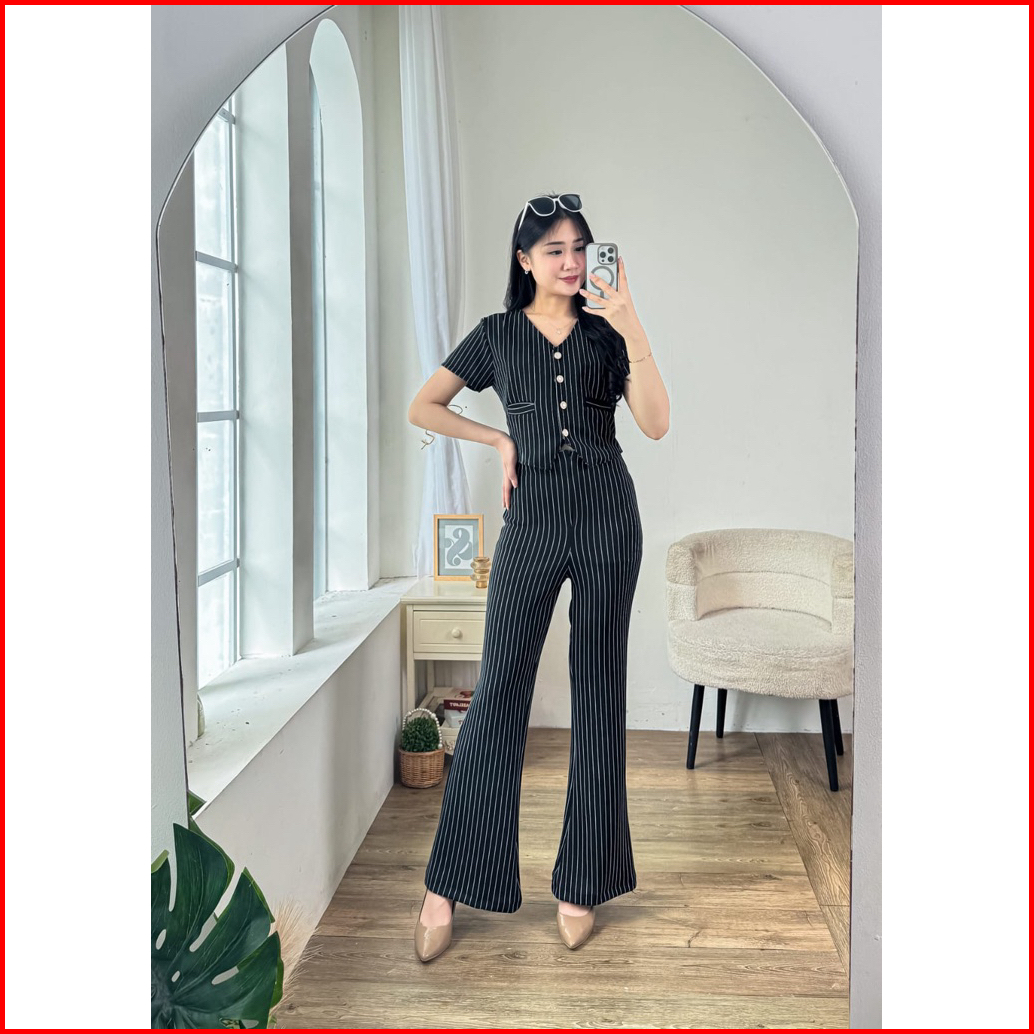 Vianfashion Set 8085 Set Setelan Baju Celana Scuba Premium Motif Salur Korea Style Fashion Wanita
