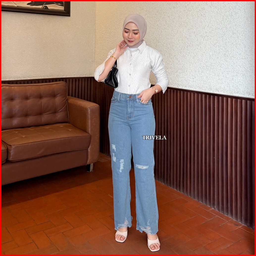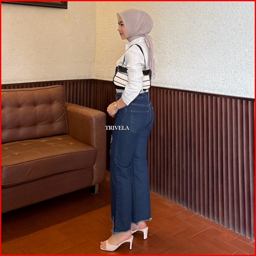 Trivela - Celana Kulot Ripped Rawis Highwaist Nonstretch Kulot Jeans Wanita Chlaudy Cullotes Plainbf