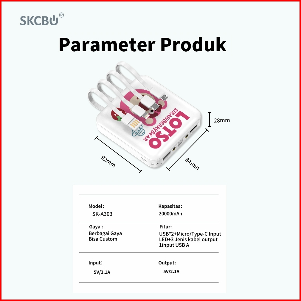 Skcbo A303 Powerbank Custom 20000mah Led Built In Cable