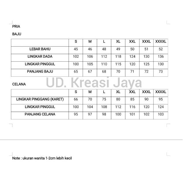 S (Wanita), S (Pria), M (Wanita), M (Pria), L (Wanita), L (Pria), XL (Wanita), XL (Pria), XXL(wanita), XXL(pria)