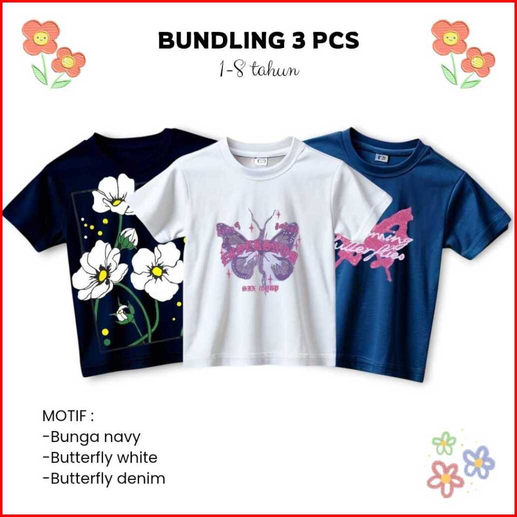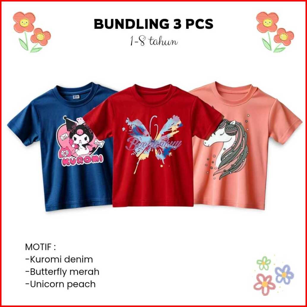 Follux - Bundling 3 Pcs T-shirt Lucu Anak Perempuan Motif Karakter Usia 1-8 Tahun