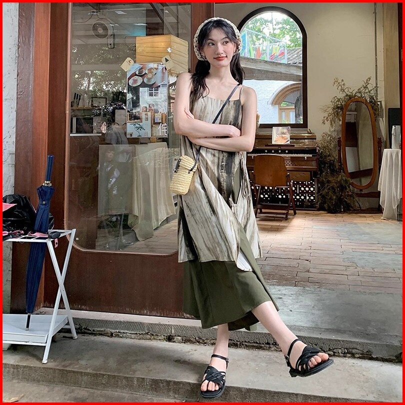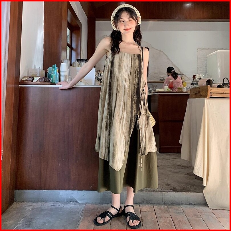 Air Qz267 Tanktop Dress Panjang Bali Daster Retro Style Tie Dye Low Collar Suspender Dress Elegant Graceful Loose Slim D