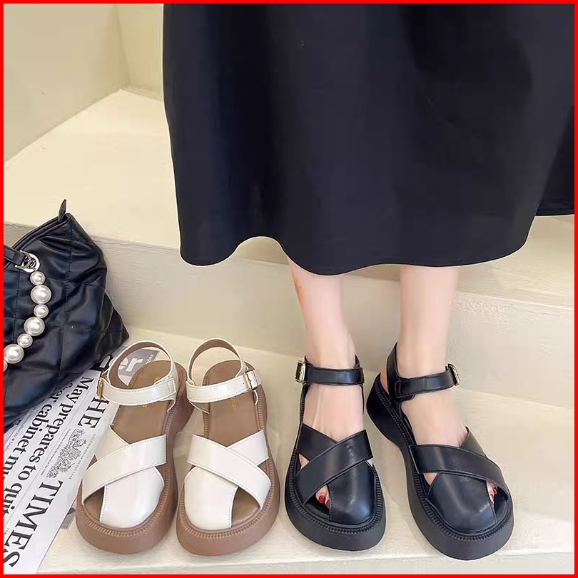 Sandal Tali Wedges Wanita Hitam Casual Elegan Korea Style