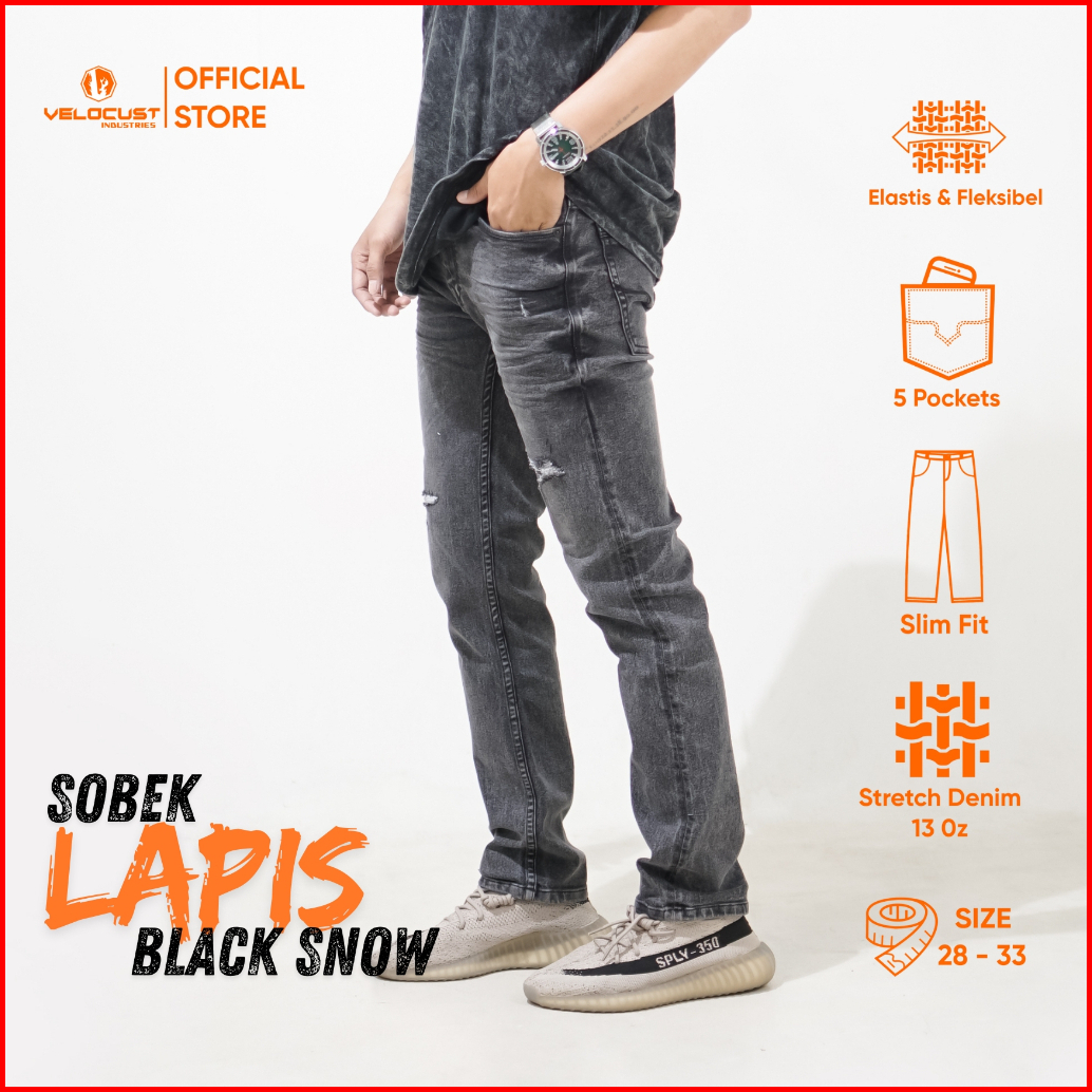 Velocust - Celana Jeans Slimfit Sobek Lapis Leather Patch Snow Sandwash